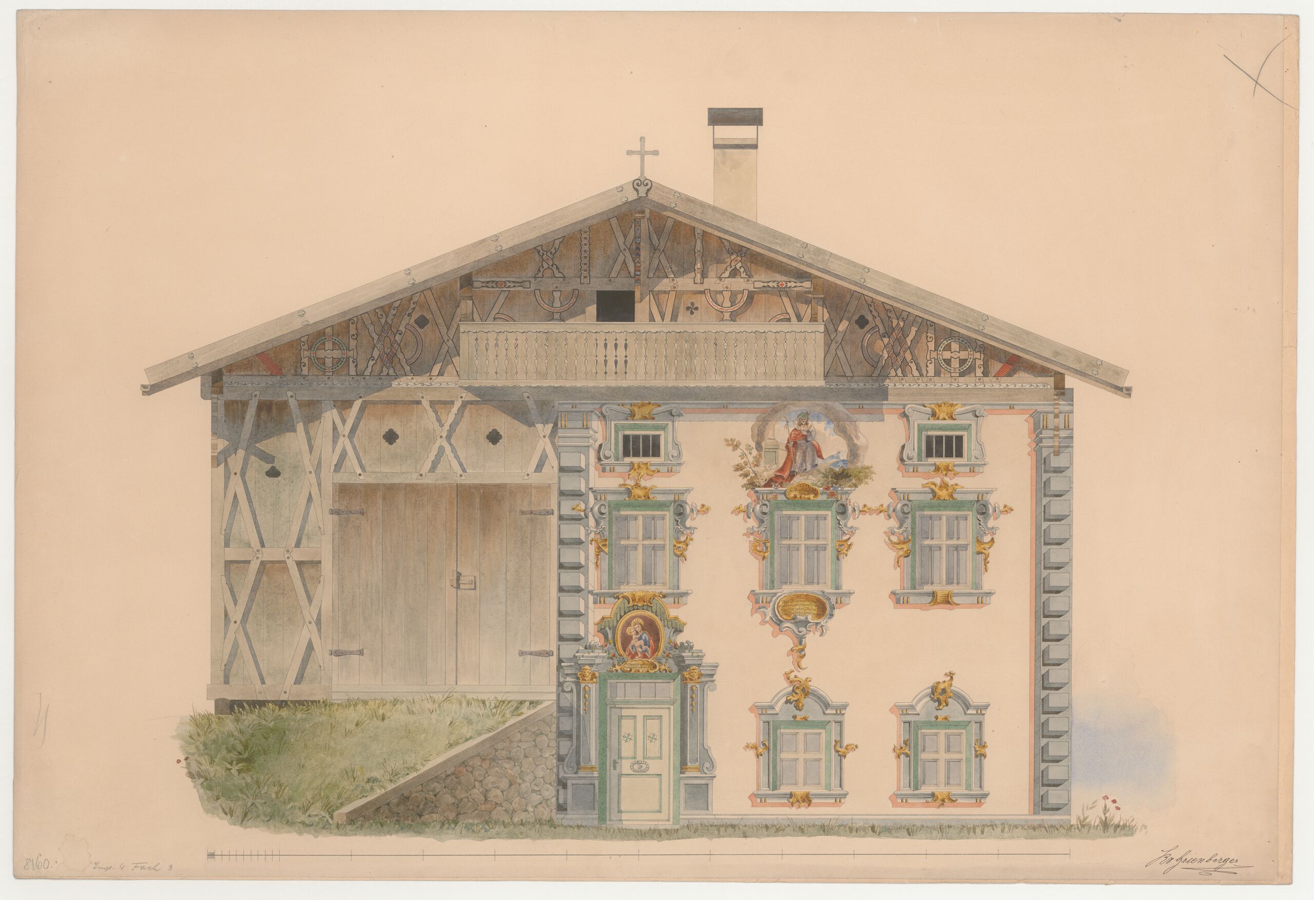 - Fassadenansicht eines zweigeteilten Tiroler Bauernhauses, dessen linke Seite für landwirtschaftliche Zwecke [Heulager?] genutzt wurde. Das Portal ziert eine Marienmalerei, eine weitere Hirtendarstellung ist teil des figuralen Bildprogrammes (deskriptiver Titel)