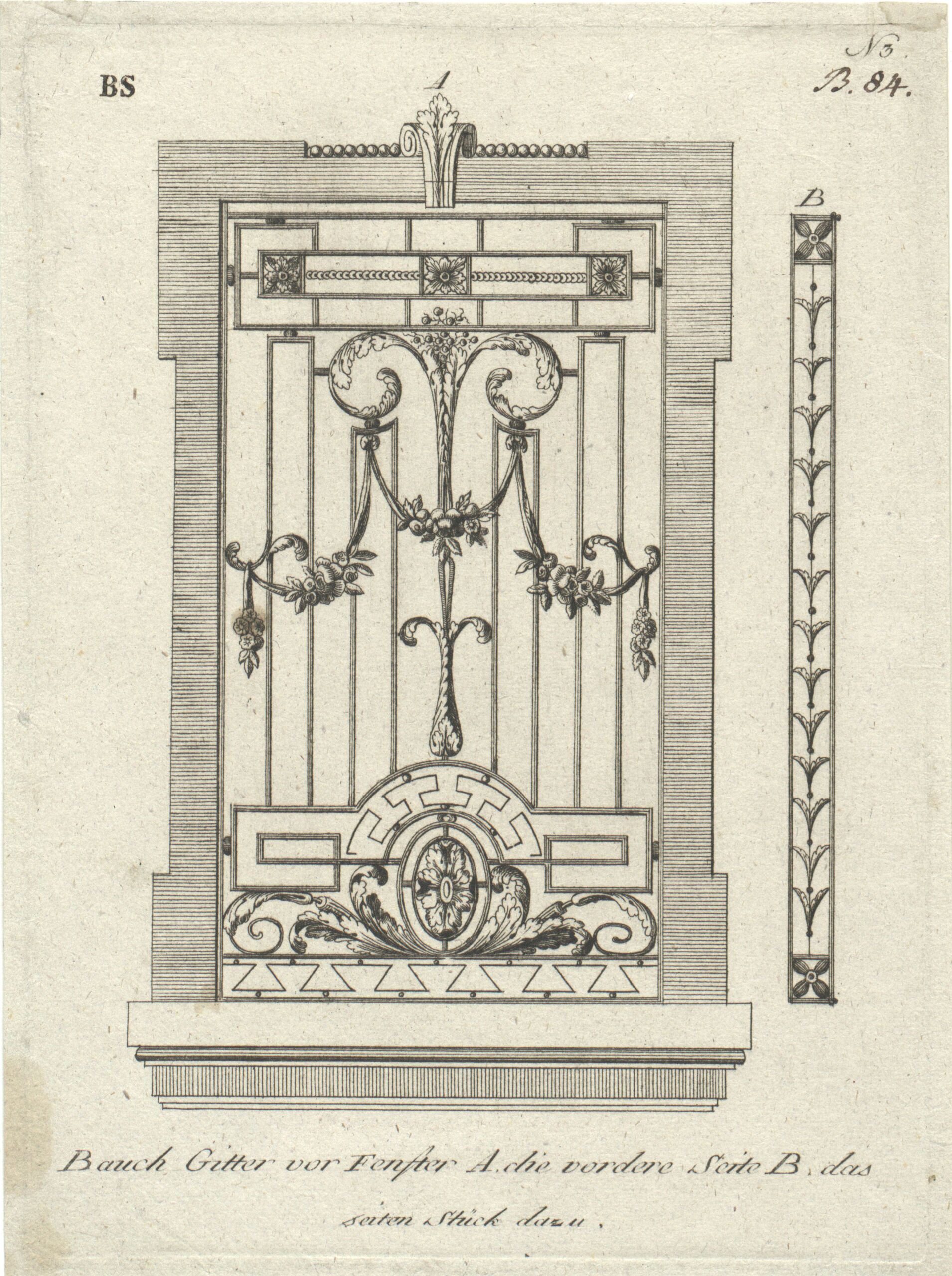 - Fenstergitter, bezeichnet „Bauchgitter vor Fenster”, Blatt 3 aus einer Folge von Schlosserarbeiten, herausgegeben von Fietta et Comp. (vom Bearbeiter vergebener Titel)