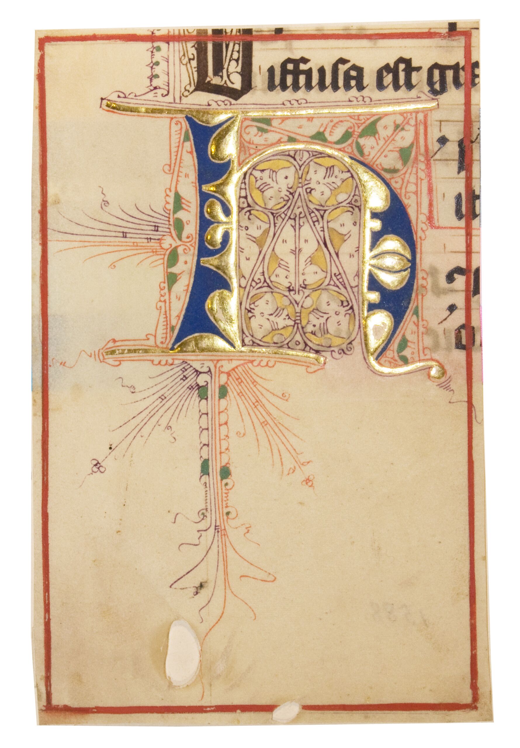 Teil eines Blattes einer Missale mit Initiale des Buchstabens "H". Darunter und daneben wechseln Textur und Notation die Zeilen, wobei es sich um Hufnagelschrift auf fünf Linien handelt. Die Filigraninitiale über vier Zeilen ist mit stilisierten Knospen und Blüten geschmückt, das an den Ecken des Initialfeldes und in der Randleiste in Perlenstäbe mit Fadenfleuronnée übergeht.