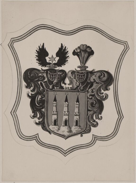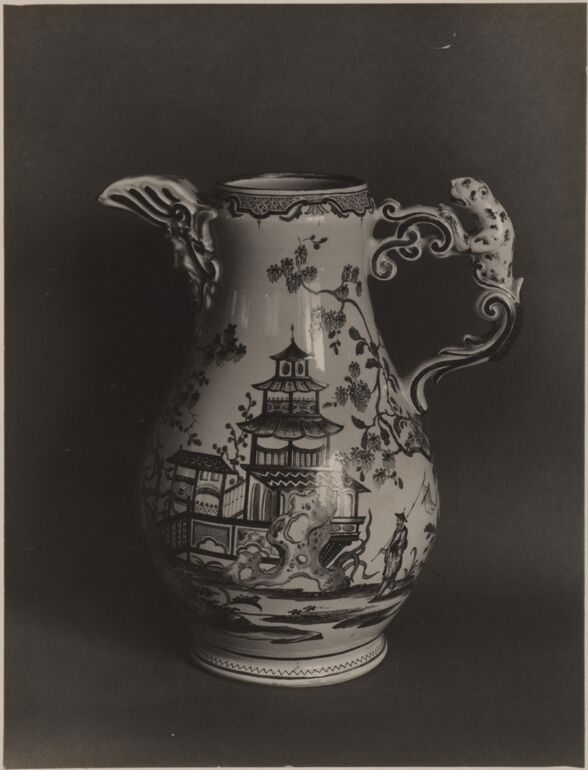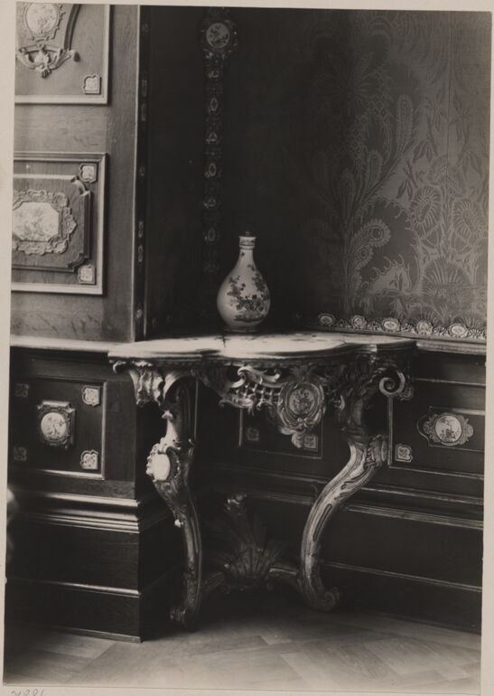 - Flasche mit Metallmontierung, Über ovalem Standring bauchige, durch Ringwülste unterteilte Form mit langem Hals und silbermontiertem Stöpsel in Form einer Kriegerbüste. Reicher Dekor in goldgehöhter Schwarzlotmalerei. Zuunterst „indianische" Fels- und Blütenmotive mit weitmaschigem Gitterwerk, auf der Schulter Rosettenfries, darüber Laub-, Bandel- und Gitterwerk mit Baldachinmotiven, zuoberst „indianische" Blumen. Vielleicht die „zwei langhalseten Flaschen oder Bouteillen zum Tokayerwein", die das „Wiener Diarium" unter den Preisen aufzählt, die beim Hauptschießen, das der Kaiser vom 22. bis zum 26. Juli 1729 veranstaltete, vergeben wurden