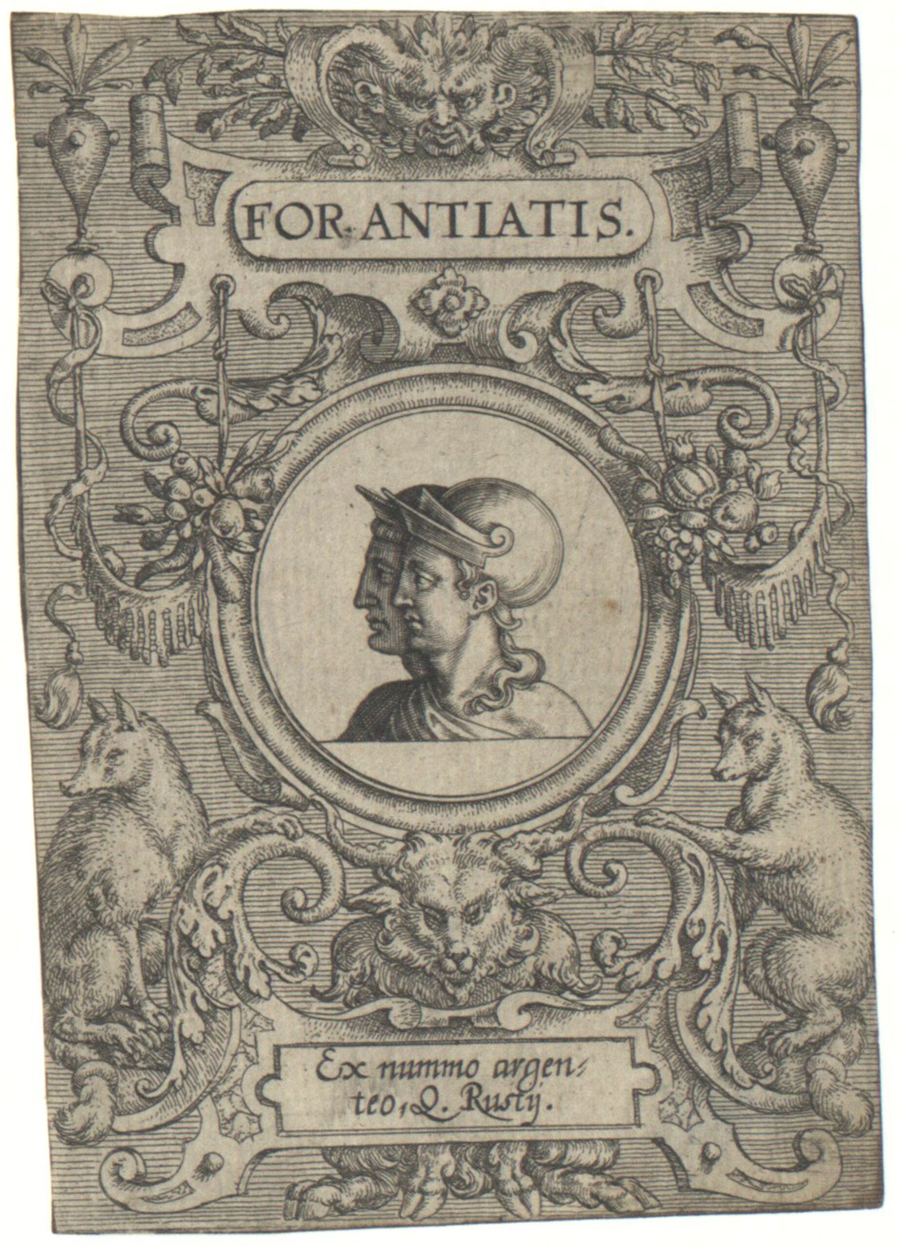 - For. Antiatis, Blatt aus Abraham Ortels (Ortelius) Folge „Deorum Dearumque“ (Götterdarstellungen von antiken Münzen in Beschlagwerkrahmen mit Grotesken), herausgegeben von P. Galle (vom Bearbeiter vergebener Titel)