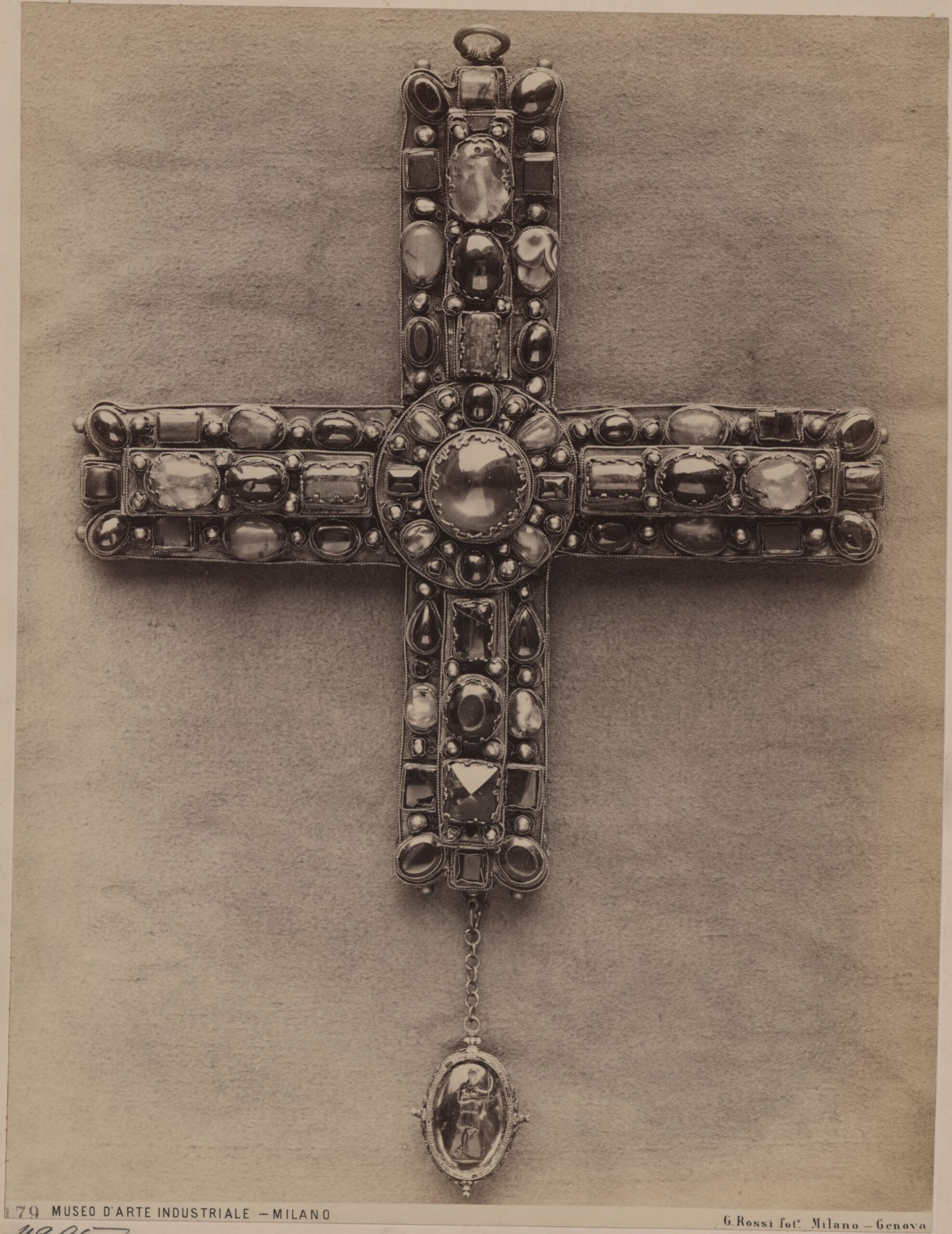 - Text am Objekt: links]: 179 MUSEO D'ARTE INDUSTRIALE – MILANO [rechts]: G. Rossi fot. Milano - Genova [Untersatzkarton, mittig, geklebt]: Croce di Berengario I - in oro e gemme. - Secolo IX / alt 0.25 / R. Basilica di Monza. [gedruckt][Untersatzkarton, rechts]: Kreuz Berengars I. aus Gold u. Edelsteinen, 9. Jh. / Dom zu Monza. [handschriftlich]