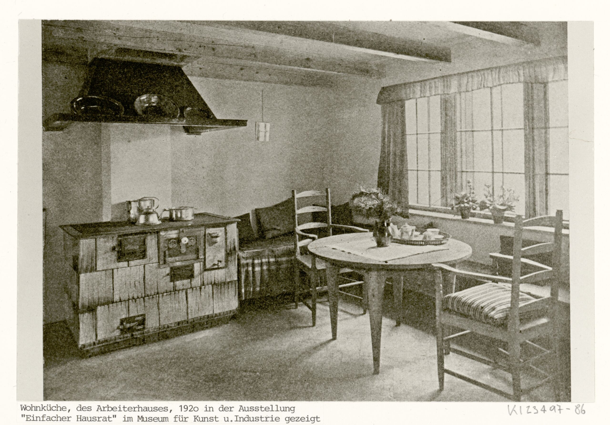- Text am Objekt: Wohnküche des Arbeiterhauses, 1920 in der Ausstellung "Einfacher Hausrat" im Museum für Kunst u. Industrie gezeigt