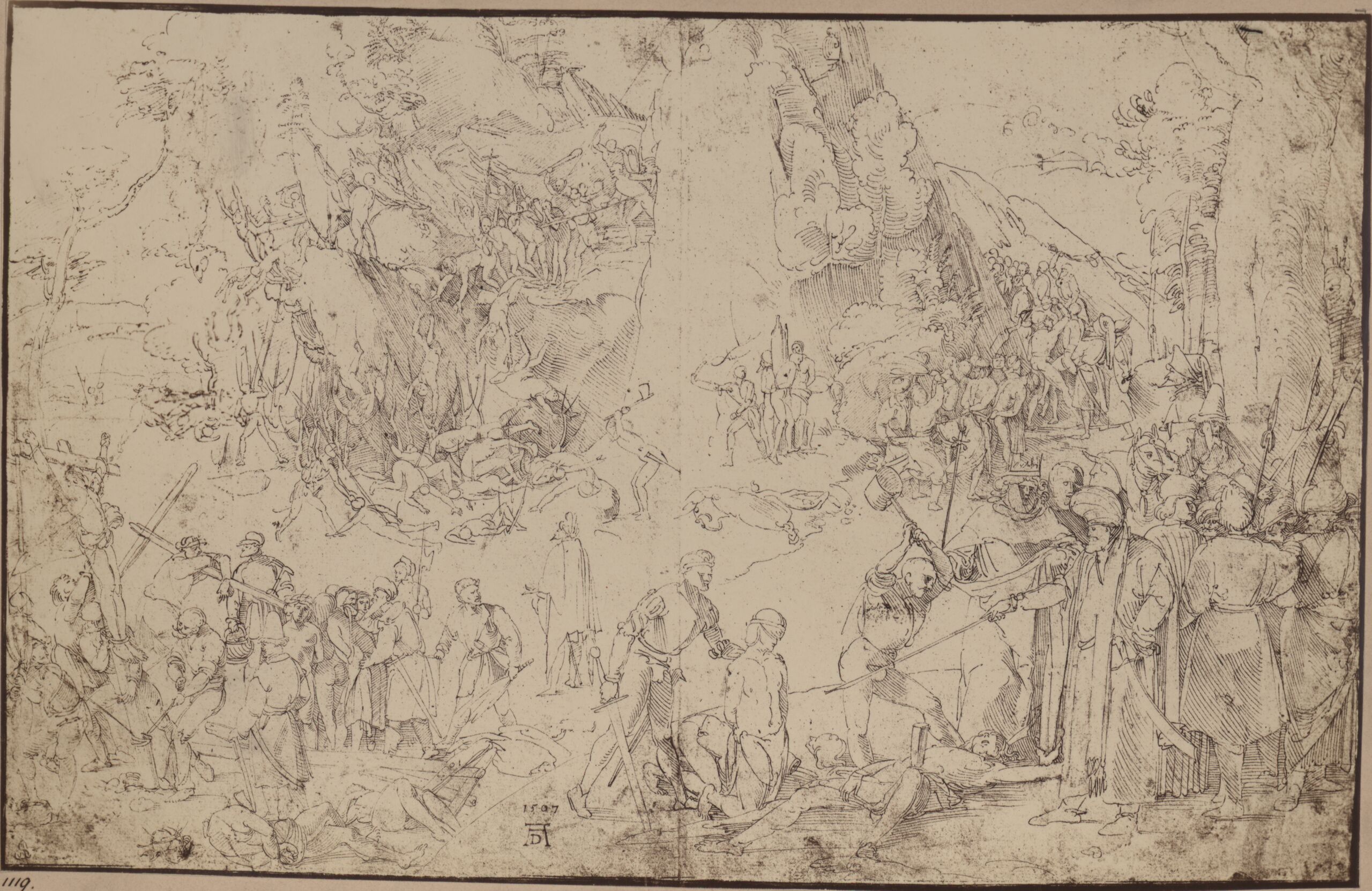 - Text am Objekt (Untersatzkarton, mittig unten) : Photographien, herausgegeben vom k. k. österr. Museum für Kunst und Industrie. / 213. / Albrecht Dürer. Die Marter der Zehntausend. Federzeichnung. / (Erzherzog Albrecht-Sammlung.) / Phot. v. L. ANGERER, k. k. Hofphotograph.
