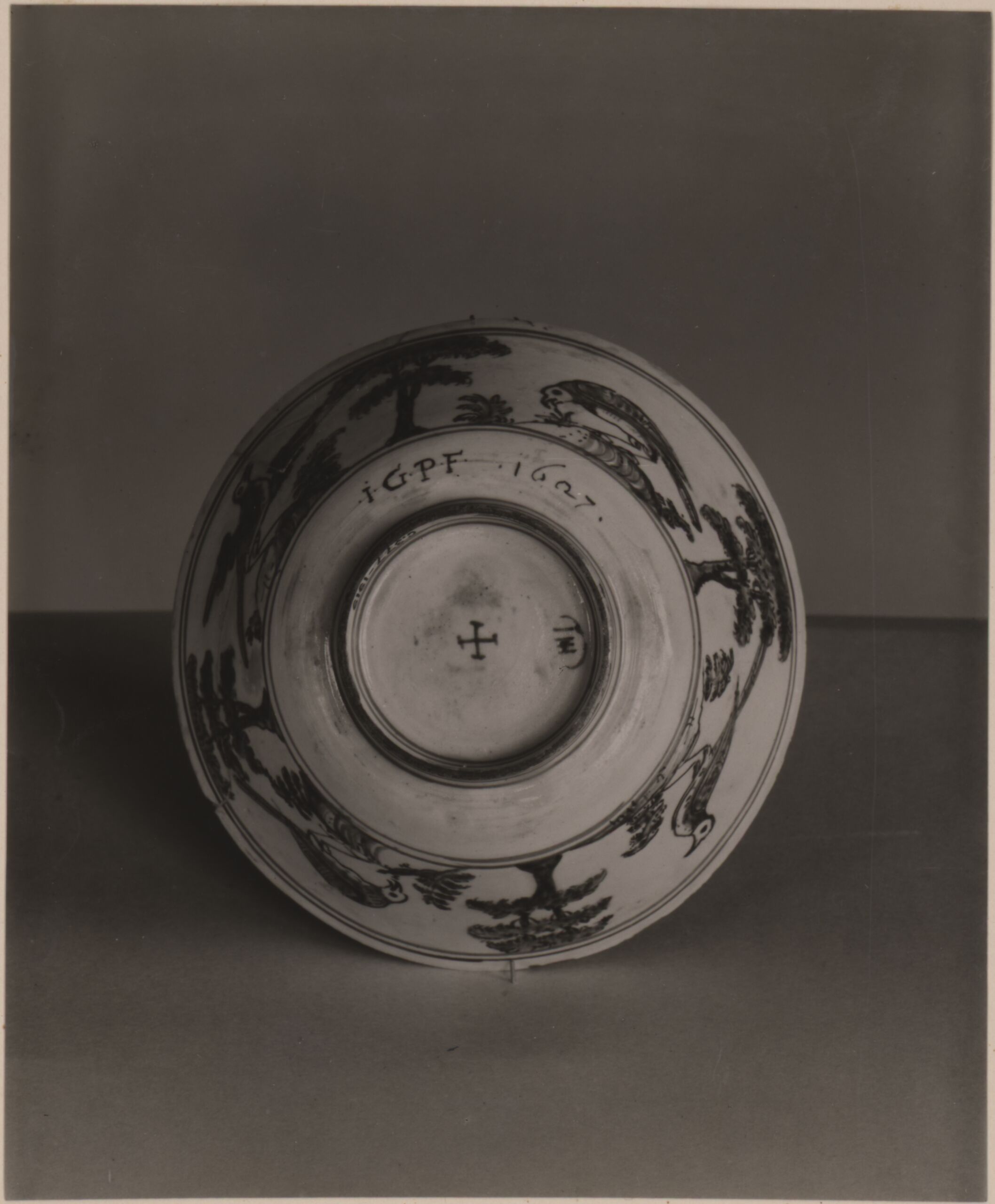 - Fotografie der Unterseite einer italienischen Porzellan-Schale mit Landschaftsdarstellung, 1627 (vom Bearbeiter vergebener Titel)