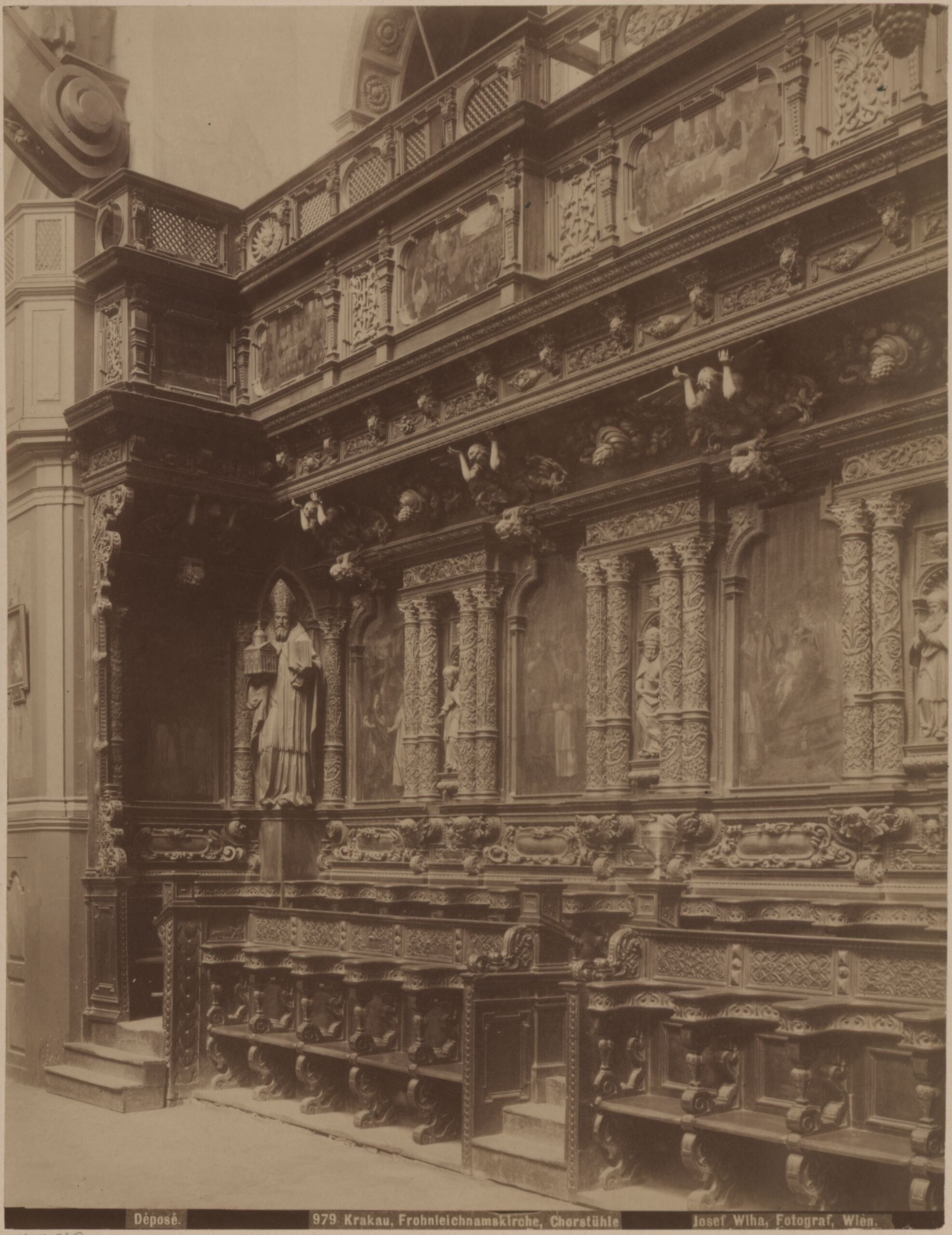 - Text am Objekt: [unten]: Déposé. 979. Krakau, Frohnleichnamskirche, Chorstühle. Josef Wlha, Fotograf, Wien [Untersatzkarton, rechts]: Chorgestühl in der Frohnleichnamskirche zu Krakau