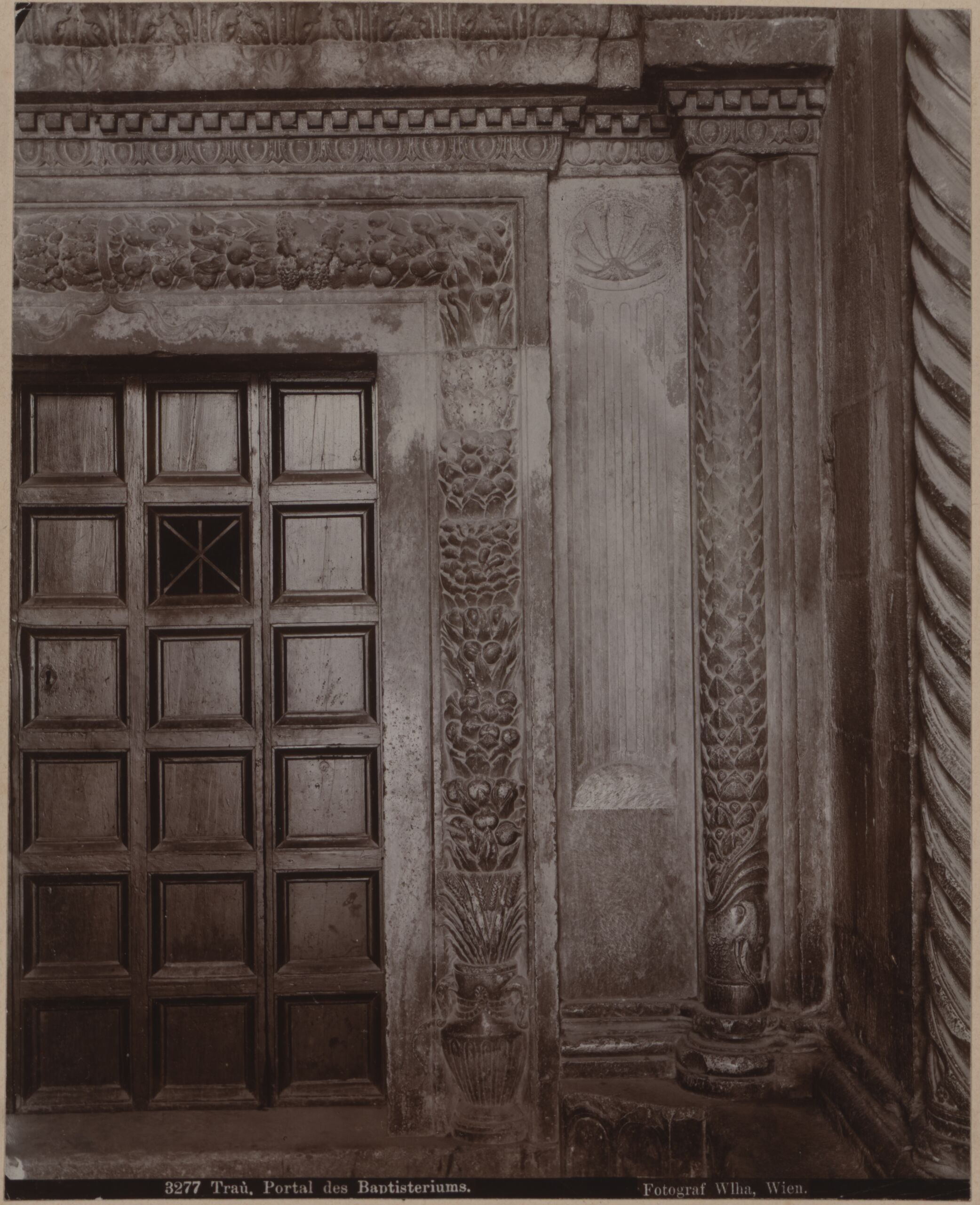 - Text am Objekt (mittig unten) : 3277 Traù, Portal des Baptisteriums. / Fotograf Wlha, Wien.