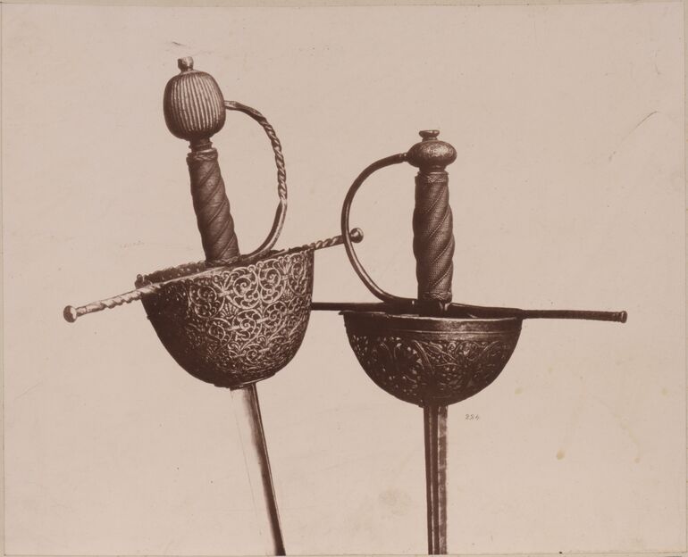 - Text am Objekt (Untersatzkarton, mittig unten) : *112. Bronzegruppe. Victoria mit einem Zweigespann auf der / Kugel. Nach einer Zeichnung von Schinkel, modellirt / von Kiss, in Bronzeguss und tauschirter Arbeit für / Friedrich Wilhelm IV. ausgeführt in den Kunstwerk- / stätten der Kgl. Gewerbe-Academie. 0,50 hoch. / Schloss Charlottenburg.