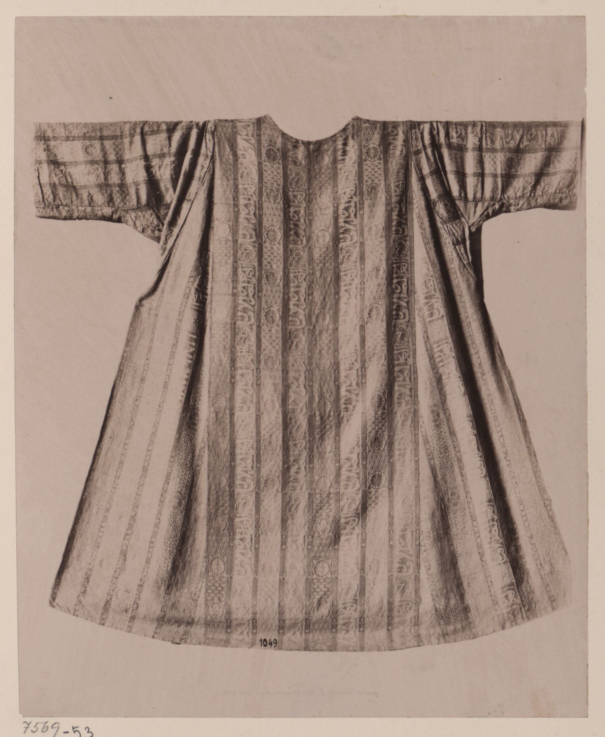 - Text am Objekt: [links]: 1049 [Untersatzkarton, rechts]: Dalmatica mit eingewebten arab. / Schriftzeichen, XIV. Jhdt.