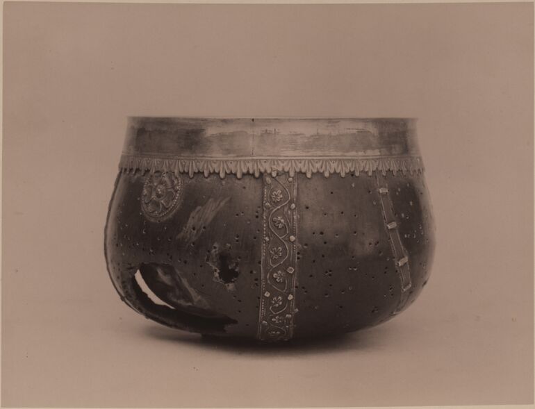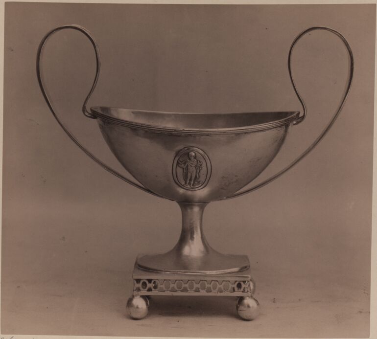 - Text am Objekt: [Untersatzkarton, links unten]: Ausstellung alter Gold- und Silber- / schmiedearbeiten, Wien 1907.[Untersatzkarton, mittig unten]: 731.[Untersatzkarton, rechts unten]: Kaffeekanne aus Vermeil, aus einem Reisenecessaire von / Biennais, Geschenk Napoleons an die Großherzogin Stephanie v. / Baden. Eigent. d. Gräfin J. E. Festetics.