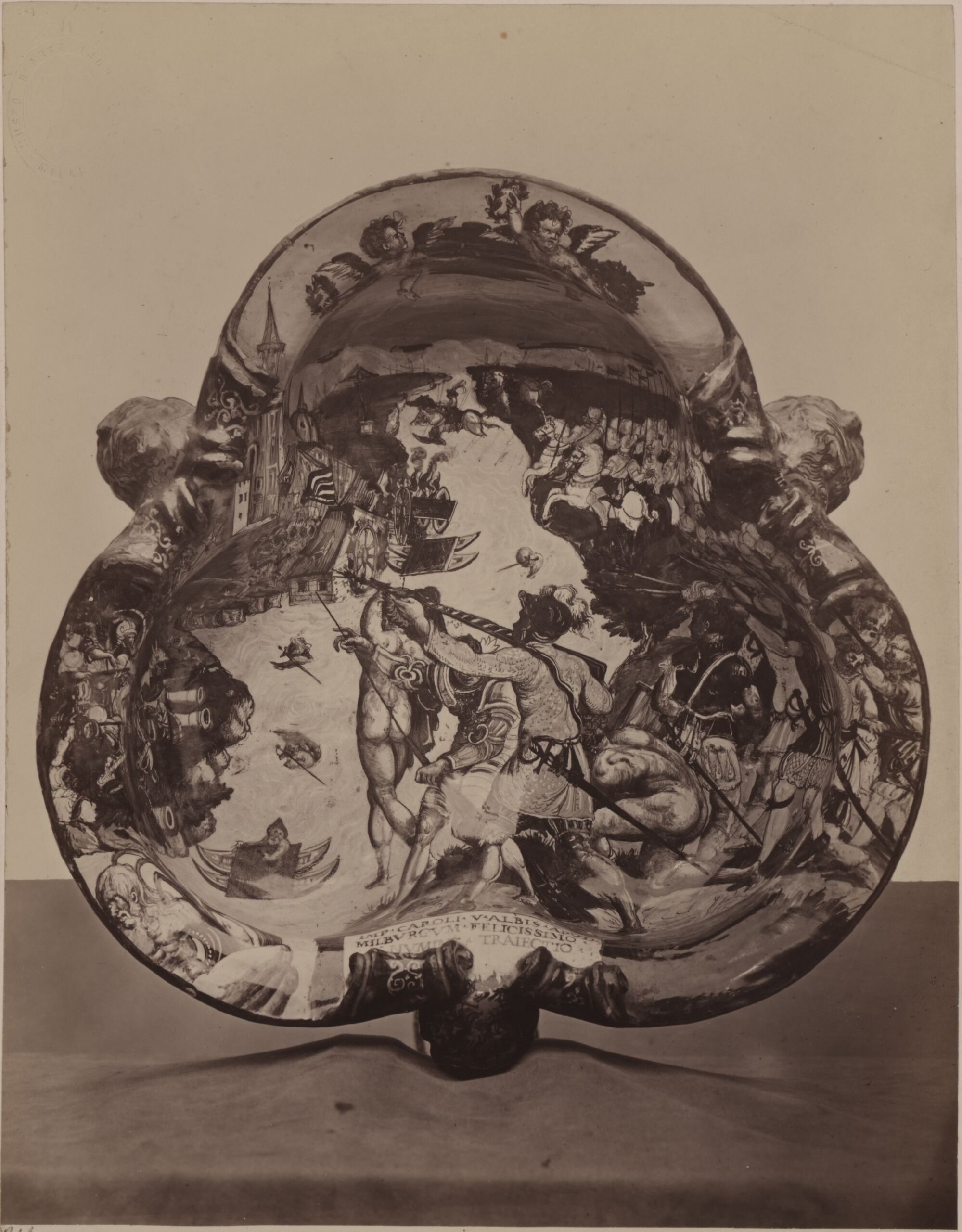 - Text am Objekt: [Untersatzkarton, mittig unten]: Vasca - majolica di Faenza / diam. 0.47 / Trotti March. Lodovico. [gedruckt, aufgeklebt][Untersatzkarton, rechts unten]: Majolikaschale (Faenza), Mitte des 16. Jahrhdts.