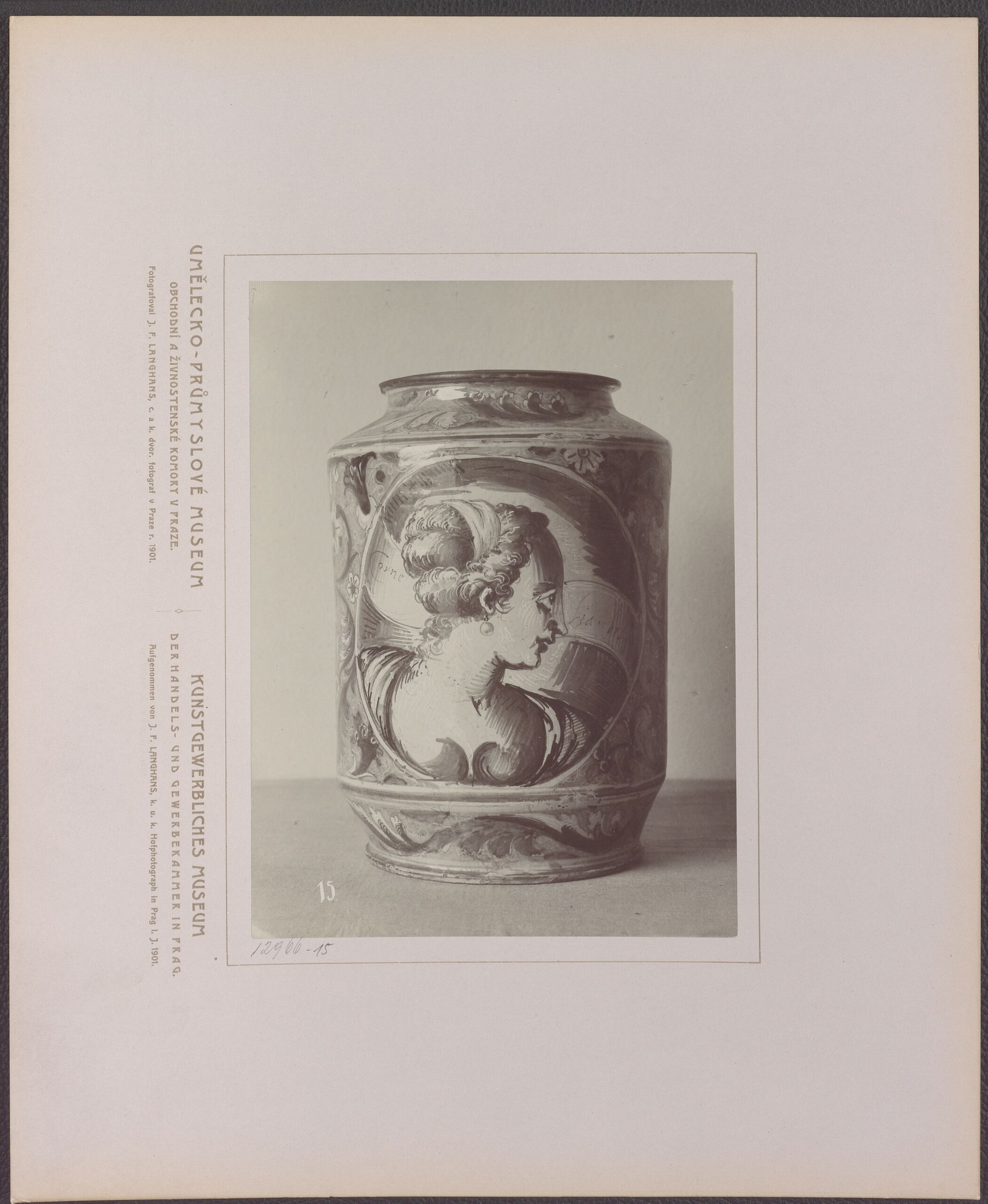- Text am Objekt: [Untersatzkarton, links unten]: UMĚLECKO-PRŮMYSLOVÉ MUSEUM / OBCHODNÍ A ZIVNOSTENSKÉ KOMORY V PRAZE. / Fotografoval J. F. Langhans, c. a k. dvorni fotograf v Praze r. 1901.[Untersatzkarton, rechts unten]: KUNSTGEWERBLICHES MUSEUM / DER HANDELS- UND GEWERBEKAMMER IN PRAG. / Aufgenommen von J. F. Langhans, k. u. k. Hofphotograph in Prag J. 1901.