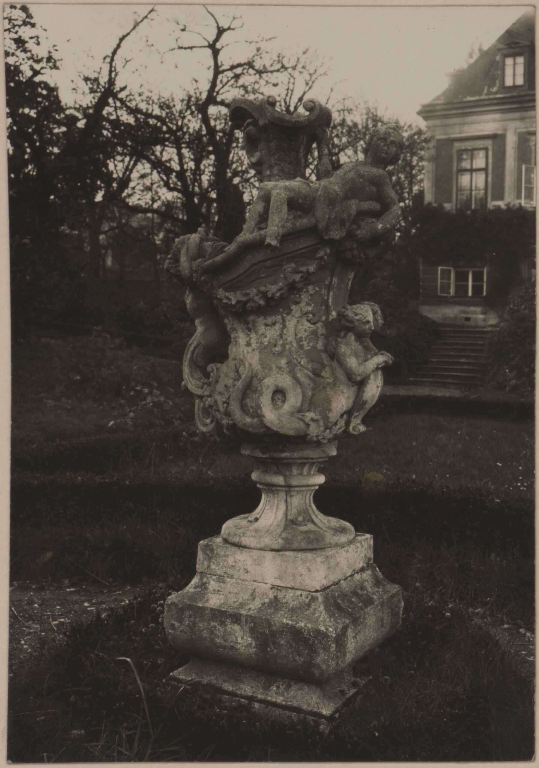 Fotografie, Fotografie einer Stein-Skulptur einer Vase mit Figuren, aus dem Schwarzenberggarten in Neuwaldegg, Adolf Tafill, MAK Inv.nr. KI 9021-1-2