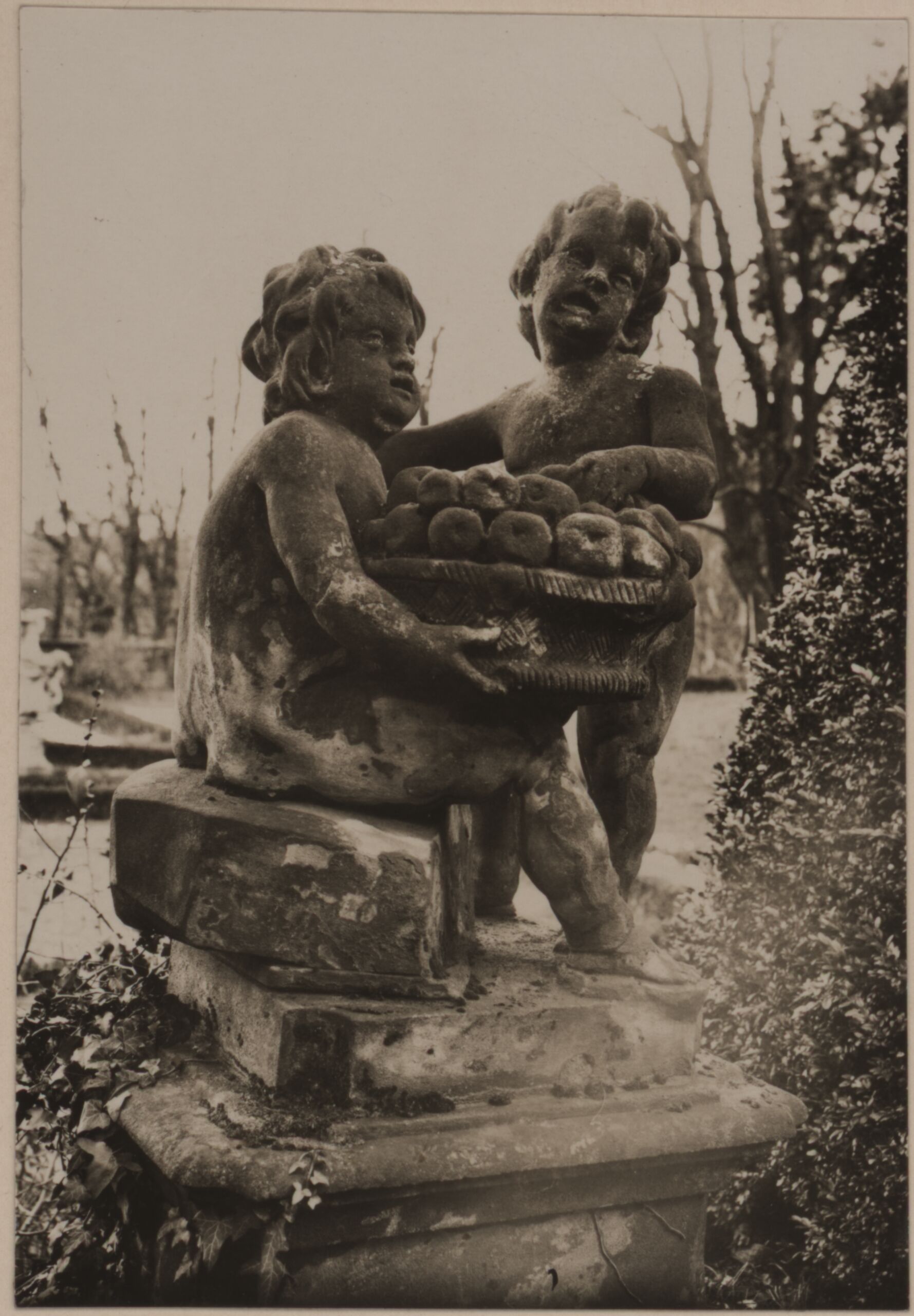 Fotografie, Fotografie einer Stein-Skulptur zweier Putten mit Korb, aus dem Schwarzenberggarten in Neuwaldegg, Adolf Tafill, MAK Inv.nr. KI 9021-2-1