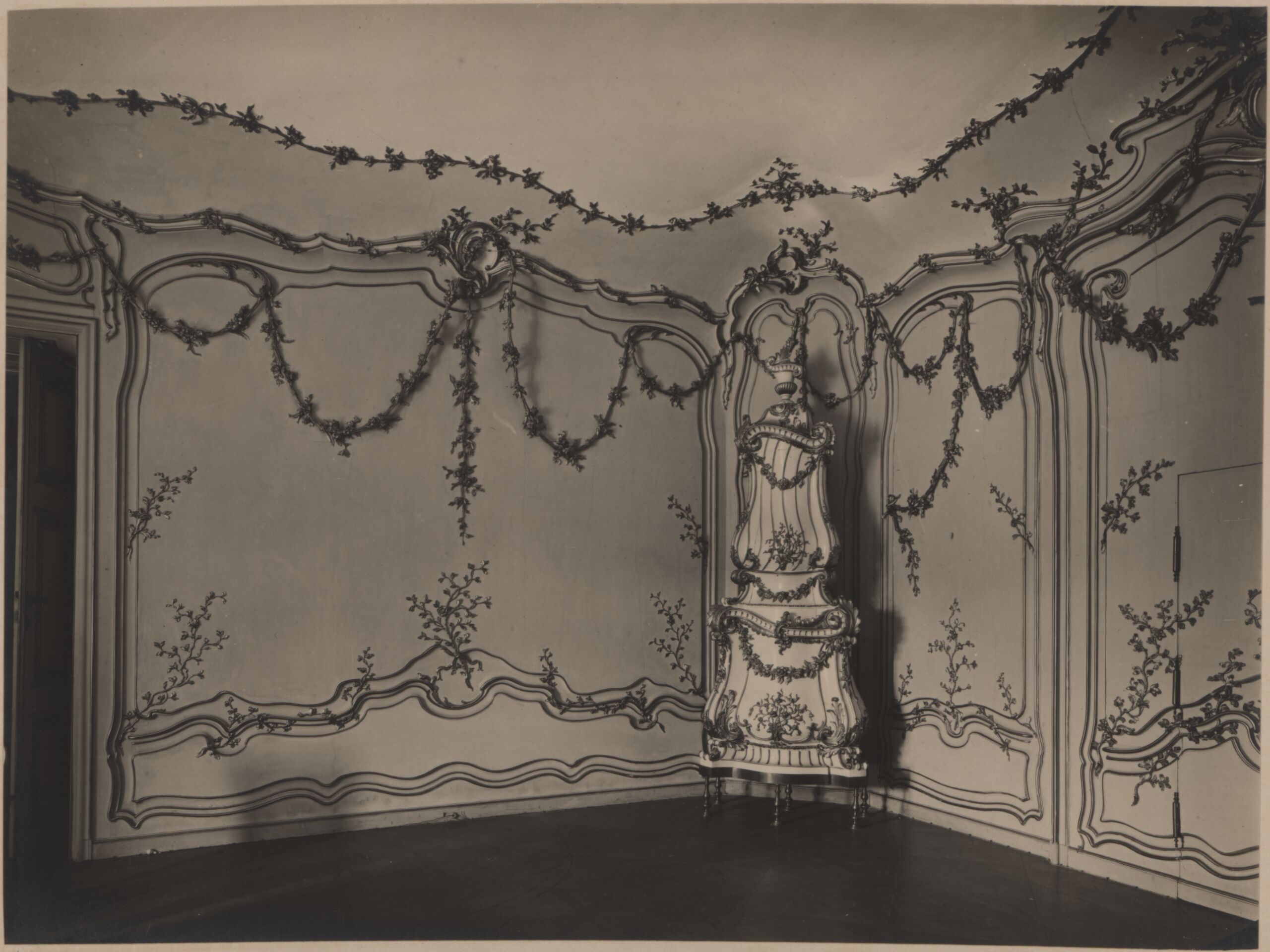 - Fotografie einer Wanddekoration und eines Ofens mit vegetabilem Dekor und Girlanden, aus Schloss Schönbrunn in Wien (vom Bearbeiter vergebener Titel)
