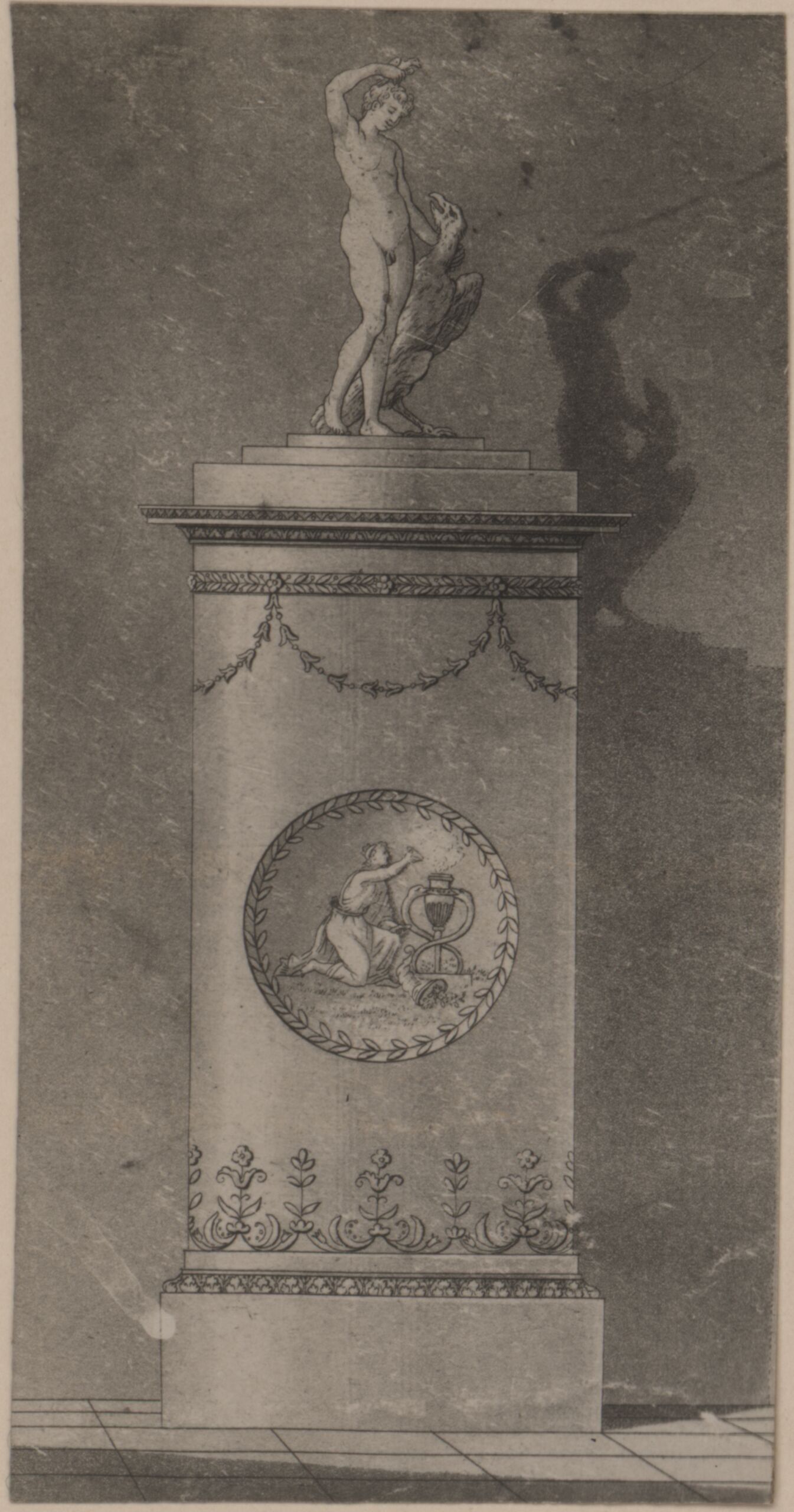 Fotografie, Fotografie einer Zeichnung eines Ofens mit Figur und Vogel, von der Werkstätte Sommerschuh in Prag, Anonym, MAK Inv.nr. KI 9005-2-1