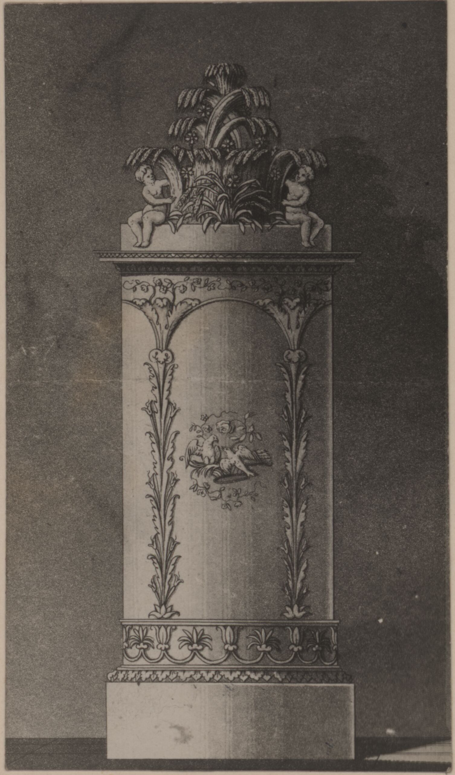 Fotografie, Fotografie einer Zeichnung eines Ofens mit sitzenden Figuren und Pflanzen, von der Werkstätte Sommerschuh in Prag, Anonym, MAK Inv.nr. KI 9005-3-1