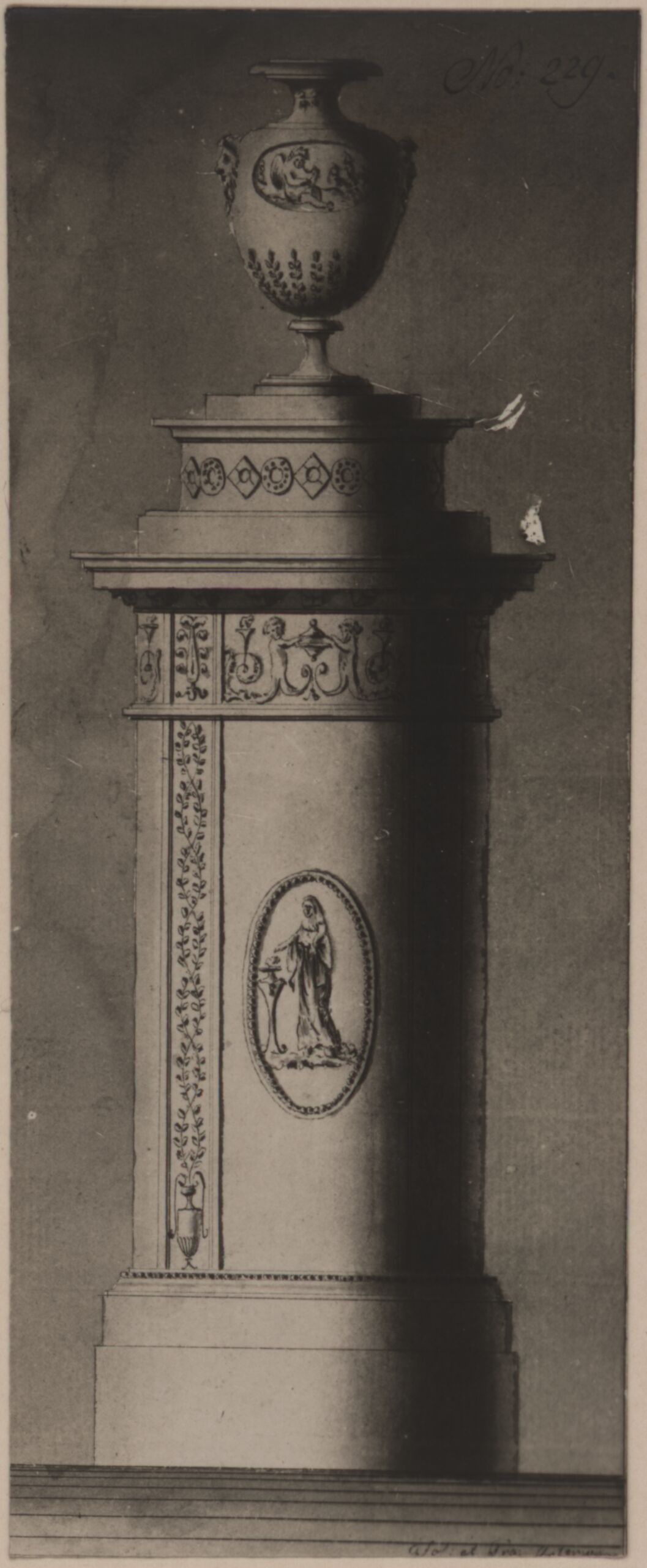 - Fotografie einer Zeichnung eines Ofens mit Vase, von der Werkstätte Sommerschuh in Prag (vom Bearbeiter vergebener Titel)