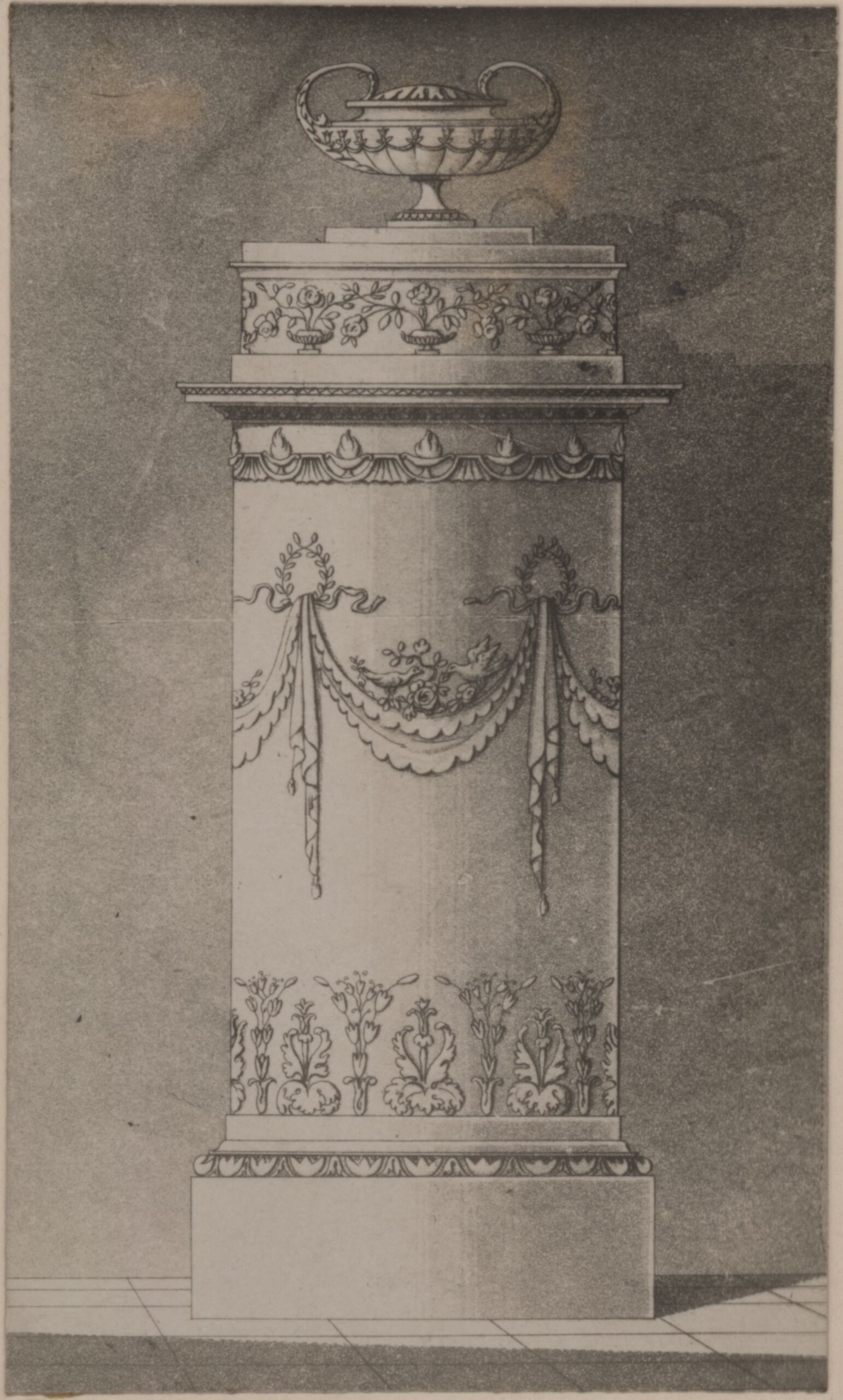 - Fotografie einer Zeichnung eines Ofens mit vegetabilem Dekor und mit Schale, von der Werkstätte Sommerschuh in Prag (vom Bearbeiter vergebener Titel)