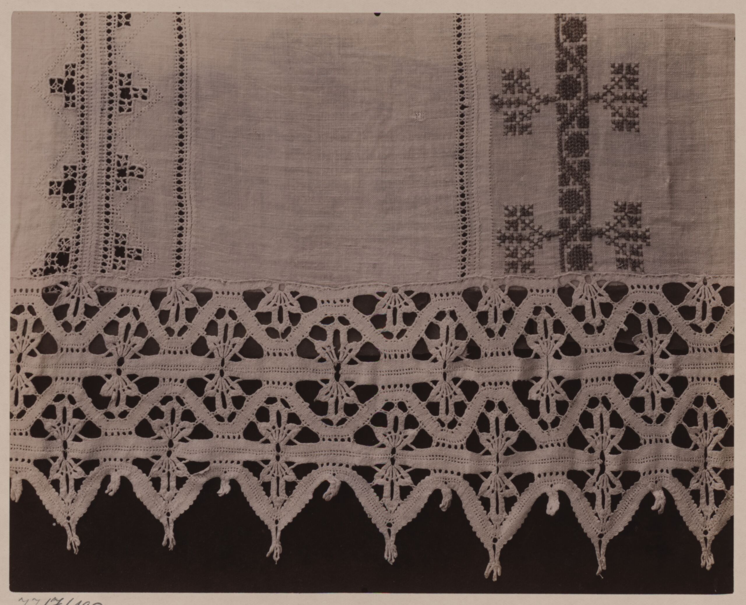 Fotografie, Fotografie eines bestickten Leinen-Behanges mit geklöppelter Spitze aus dem Museum für österr. Volkskunde, Wien, Wilhelm Gmeiner, MAK Inv.nr. KI 7717-195