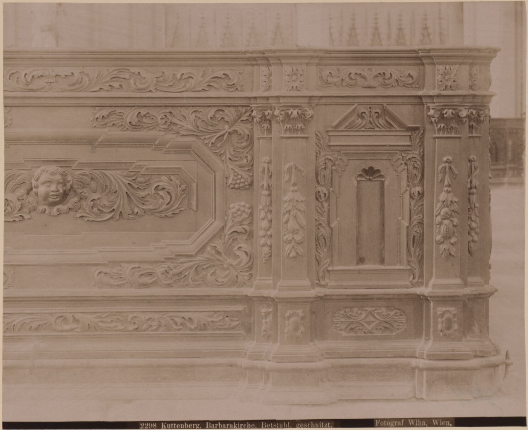 - Text am Objekt: [unten]: 2298. Kuttenberg, Barbarakirche, Betstuhl, geschnitzt. Fotograf Wlha, Wien. [Untersatzkarton, rechts]: Geschnitzter Betstuhl in der Barbarakirche zu / Kuttenberg