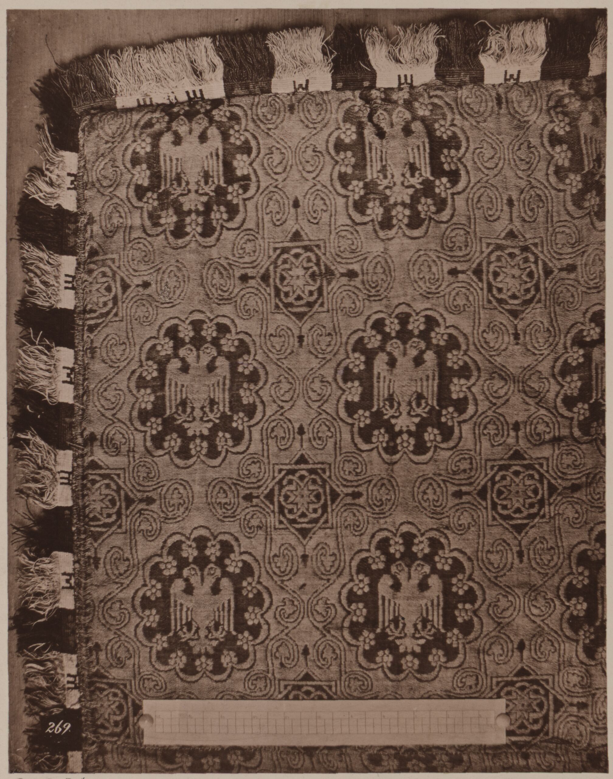- Text am Objekt: 269. [Untersatzkarton, mittig unten]: Brokatstoff, rothe Seide und Gold. Muster doppelköpfige Adler und geometrisch verschlungene Blattornamente. 0,44 lang, 036 breit. XIII Jahrh. / Halberstadt Domschatz
