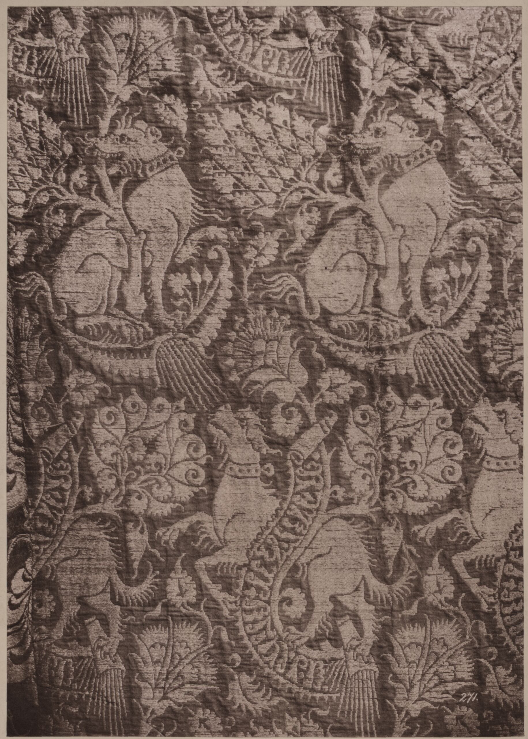 - Text am Objekt: 271. [Untersatzkarton, mittig unten]: Brokatstoff, rothe Seide und Goldmuster. Sitzende und springende Hunde reihenweise geordnet mit Schriftbändern und Pflanzenwerk. Italien XIV. Jahrh. / Stralsund. Kalandsbrüderschaft.