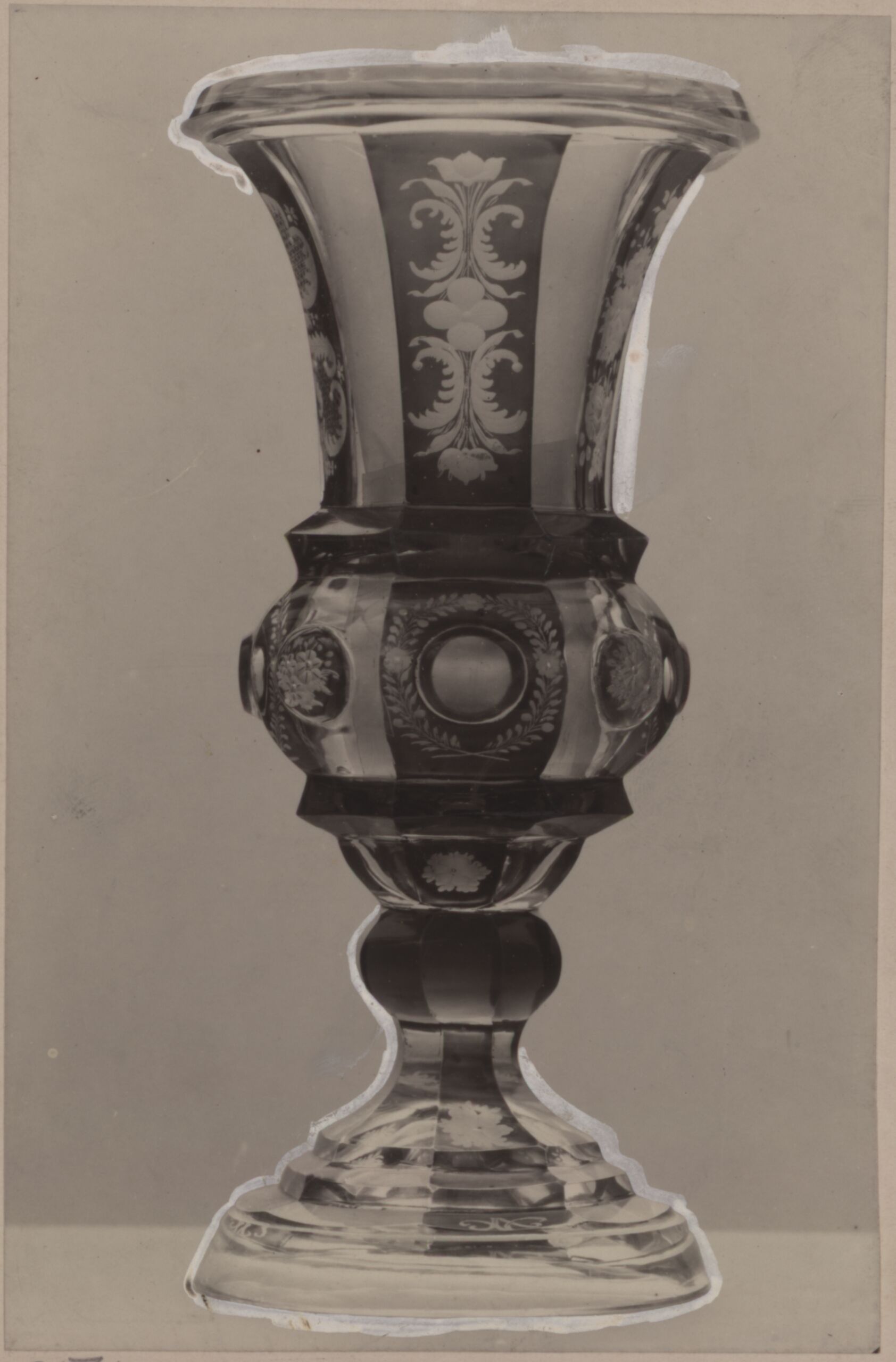 Fotografie, Fotografie eines bunten Glas-Pokals mit Rocaille- und Blumenornamenten, Anonym, MAK Inv.nr. KI 9564-23