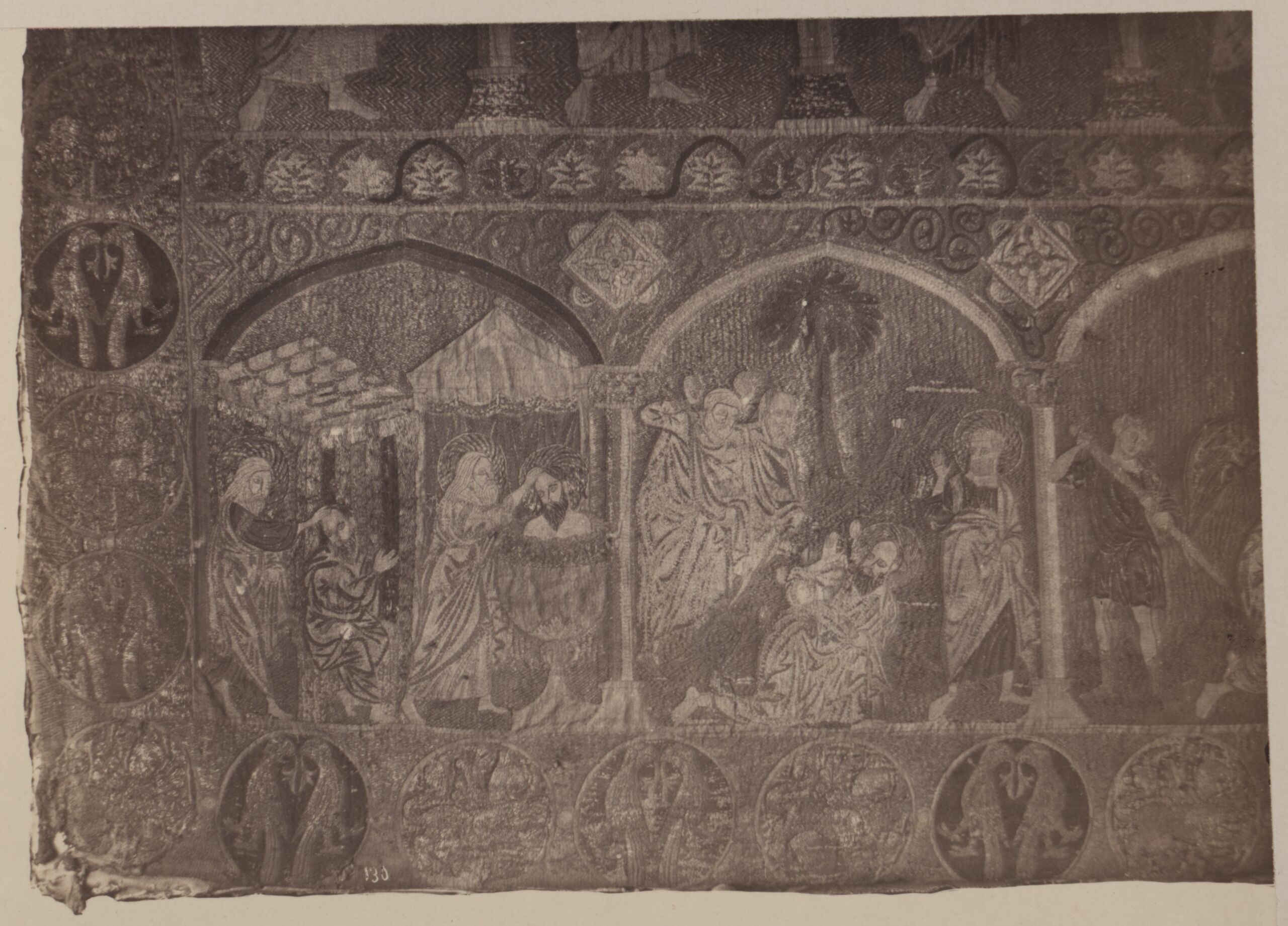 • Text am Objekt: [Untersatzkarton, mittig, aufgeklebt]: 146. Autres details: S. Pierre, S. Jacques majeur, apotre (129). [Untersatzkarton, mittig unten, aufgeklebt]: 147. Details de la partie inférieure: Baptéme de S. Paul, sa la- / pitation (130). [Untersatzkarton, links unten]: Rom Exposition religieuse 1870 [Untersatzkarton, rechts unten]: Details von einer Altardecke / XIII. Jh., Anagnie, Domschatz.