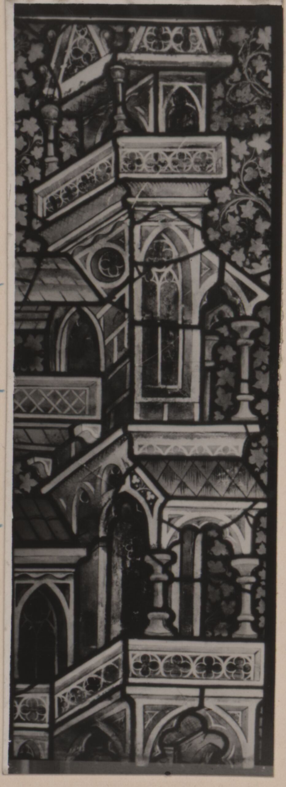 Fotografie, Fotografie eines Details einer Glasmalerei aus dem Stephansdom mit einer Architekturdarstellung, 1375-1400, Österreichische Lichtbildstelle, MAK Inv.nr. KI 9256-6-3