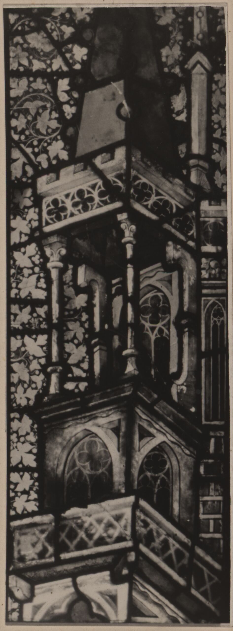 Fotografie, Fotografie eines Details einer Glasmalerei aus dem Stephansdom mit einer Architekturdarstellung, 1375-1400, Österreichische Lichtbildstelle, MAK Inv.nr. KI 9256-8-4