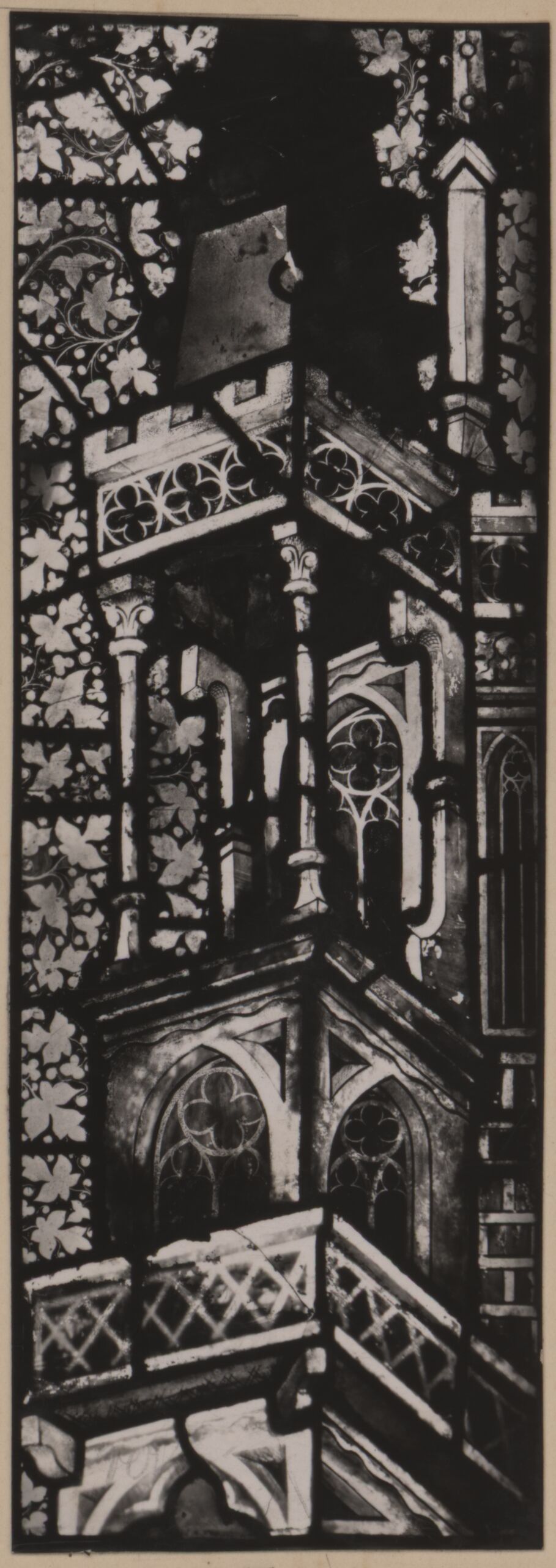 • Fotografie, Fotografie eines Details einer Glasmalerei aus dem Stephansdom mit einer Architekturdarstellung, 1375-1400, Österreichische Lichtbildstelle, MAK Inv.nr. KI 9256-11-1