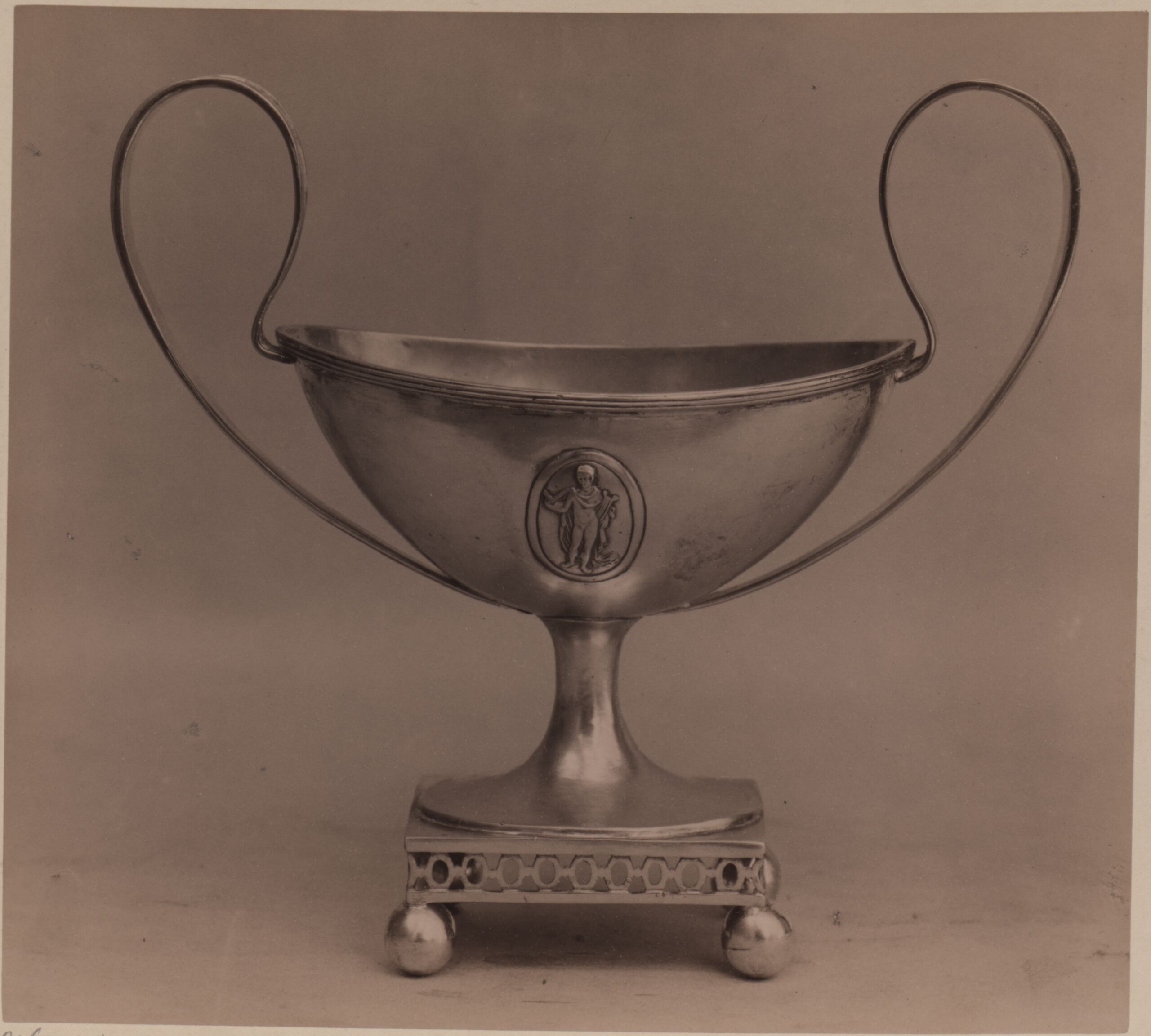 - Text am Objekt: [Untersatzkarton, links unten]: Ausstellung alter Gold- u. Silberschmiede- / arbeiten im Österr. Museum, Wien 1907.[Untersatzkarton, mittig unten]: Nr. 1114[Untersatzkarton, rechts unten]: Doppelhenkeliges elliptisches Gefäß, 1809/10. / Österr. Empirie. Eigent. Frau Klara Goldschmidt.