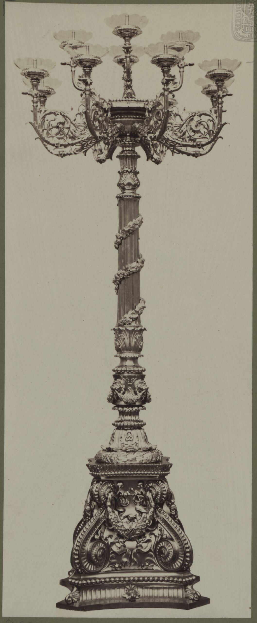 - Fotografie eines Gaskandelabers mit 12 Flammen, aus dem Jahr 1865, ausgeführt von der Bronzewarenfabrik & Erzgiesserei D. Hollenbach's Neffen Ed. & F. Richter in Wien (vom Bearbeiter vergebener Titel)