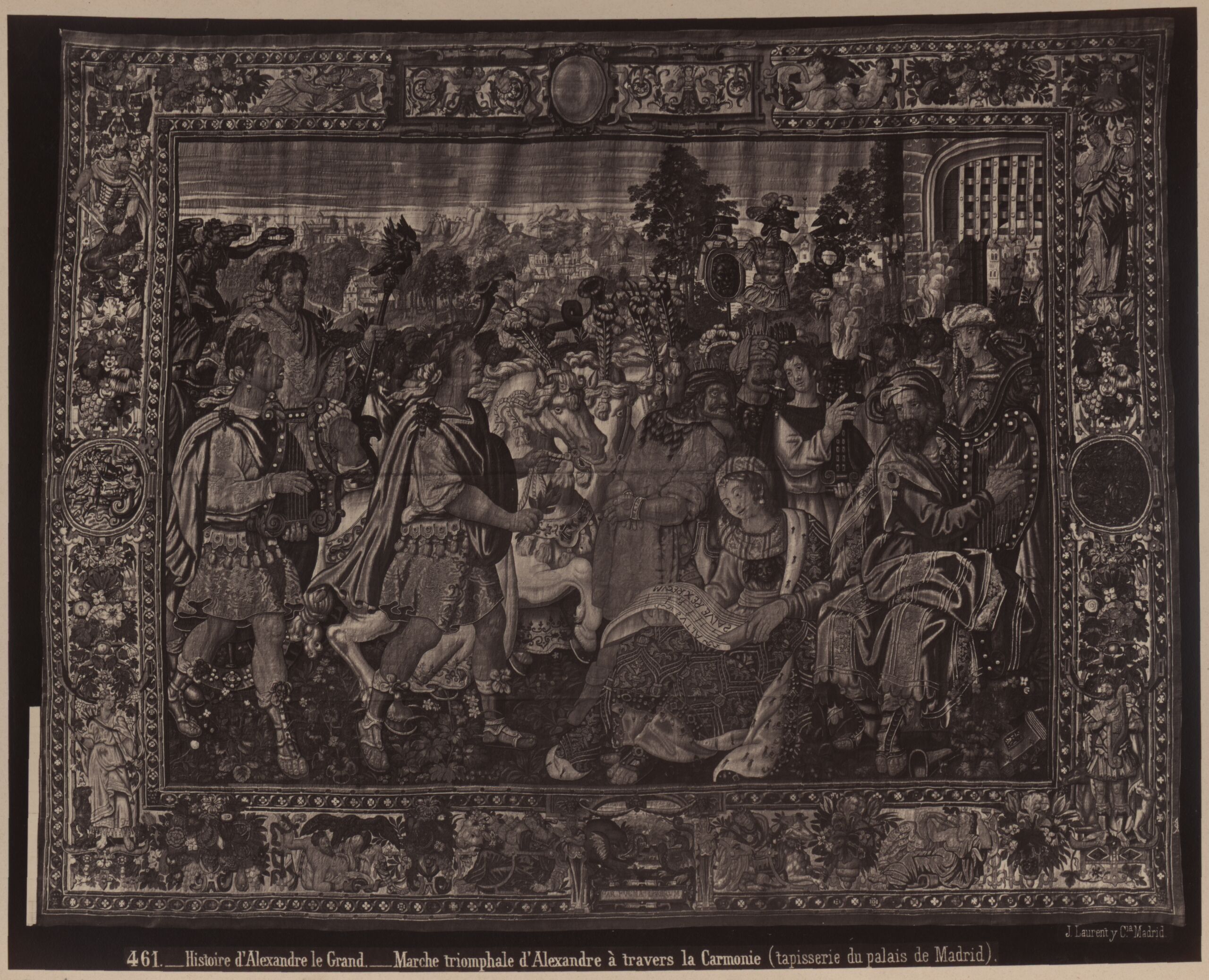 - Text am Objekt: J. Laurent y Cia. Madrid / 461._Historie d'Alexandre le Grand._Marche triumphale d'Alexandre à travers la Carmonie (tapisserie du palais de Madrid) [Untersatzkarton, rechts]: Brüsseler Gobelin, XVI Jhdt. / Geschichte Alexanders d. Gr.: Alexanders Triumphzug. / Madrid, kgl. Schloss.
