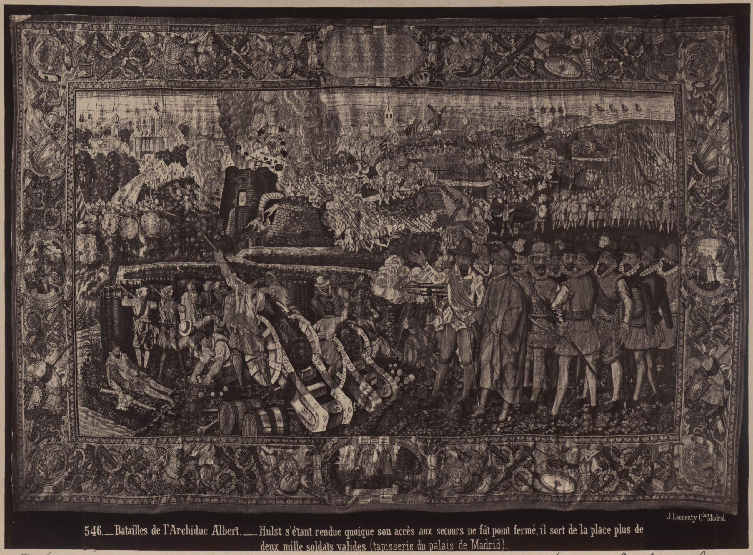 - Text am Objekt: J. Laurent y Cia. Madrid / 546._Batailles de L'Archduc Albert._Hulst s'etant rendue quoique son accès aux secours ne fut fermé, il sort de la plus de deux mille soldats valides (tapisserie du palais de Madrid) [Untersatzkarton, rechts]: Brüsseler Gobelin, 2. Hälfte d. XVI. Jhdts. / Die Schlachten des Erzh. Albert : Hulst ergibt sich. / Madrid, Kgl. Schloss.