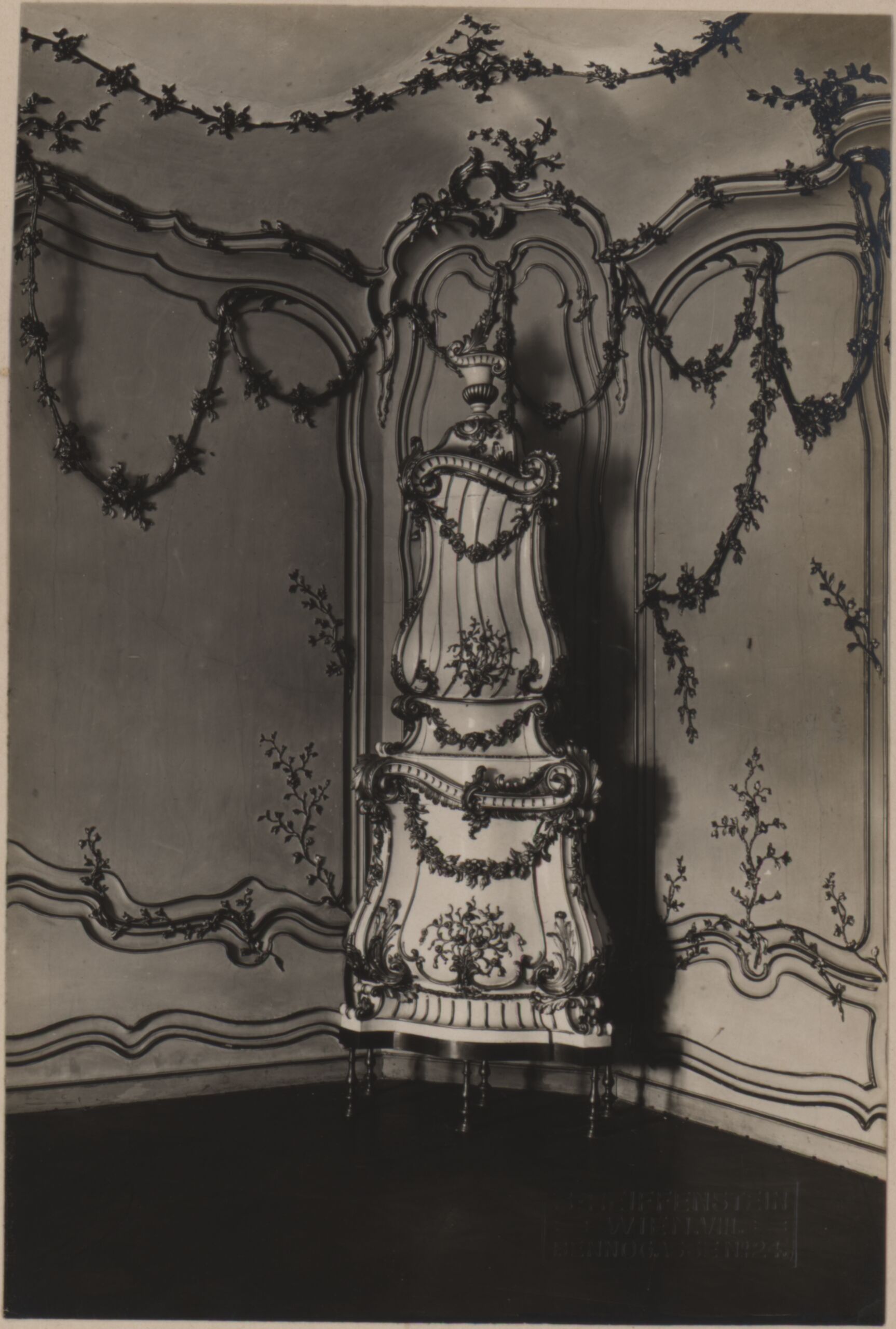 - Fotografie eines Interieurs und eines Ofens mit vegetabilem Dekor und Girlanden, im Schloss Schönbrunn in Wien (vom Bearbeiter vergebener Titel)