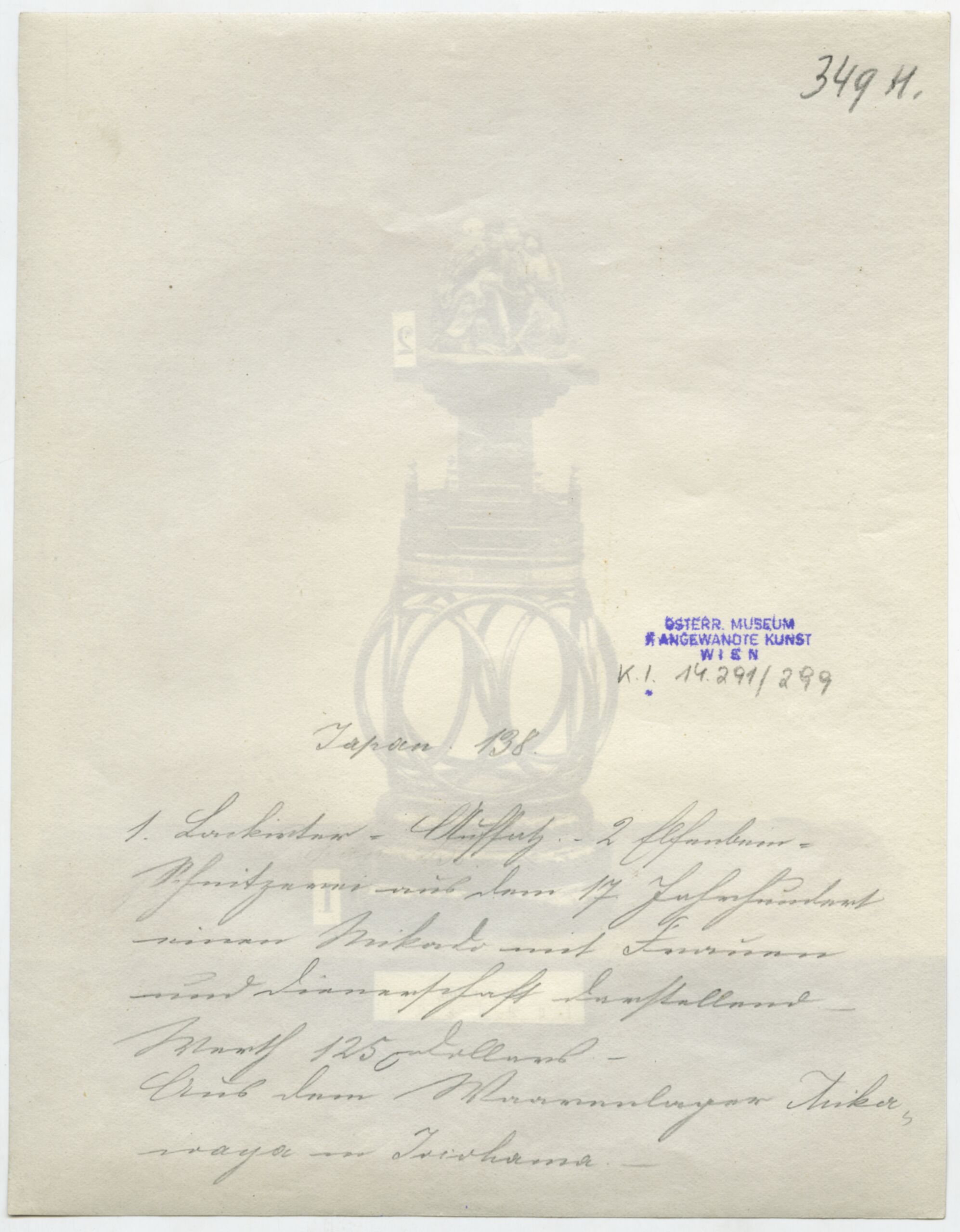 - Text am Objekt (Rückseite) : [Rückseite] 349 H. / Japan. 138. / 1. Lackirter Aufsatz. - 2. Elfenbein- / Schnitzerei aus dem 17. Jahrhundert / einen Mikado mit Frauen und Dienerschaft darstellend. / Werth 125 Dollars - / Aus dem Waarenlager Mika- / vaya [?] in Jocohama. -