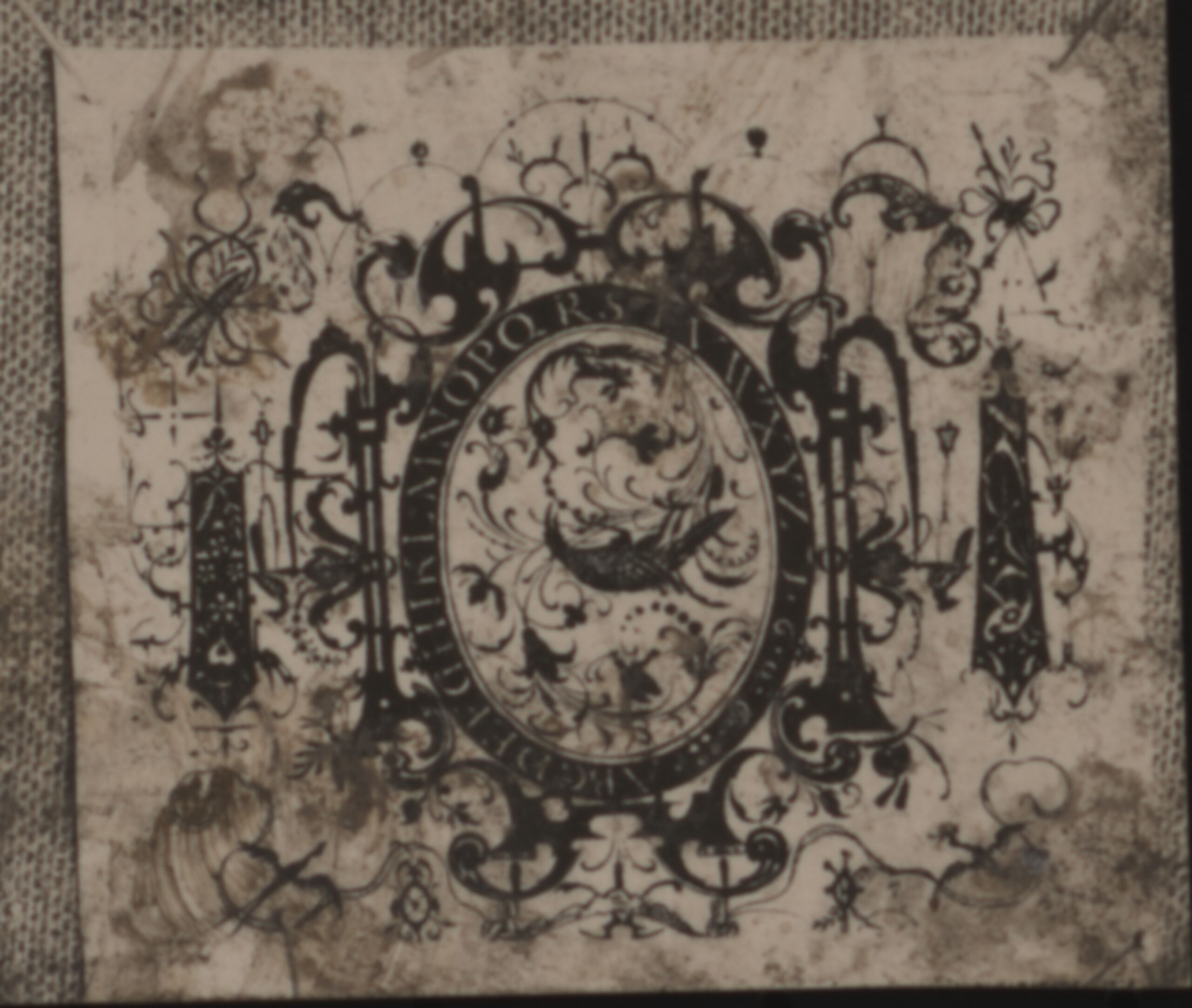 • Fotografie eines Ornamentstichs eines Schweifwerkornaments mit Alphabet von Esaias van Hulsen (vom Bearbeiter vergebener Titel)