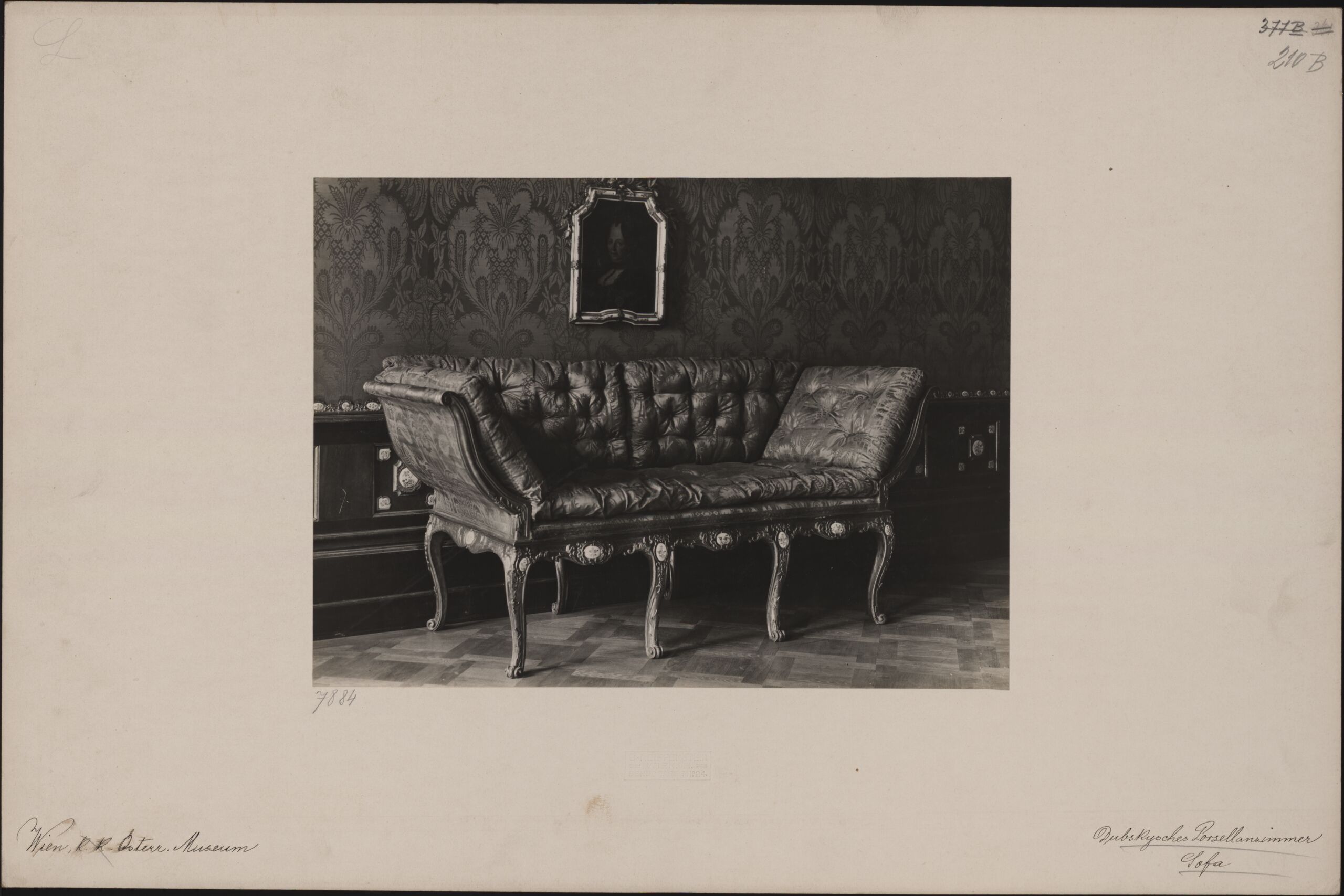 - Text am Objekt: [Untersatzkarton, links unten]: Wien, k. k. Österr. Museum[Untersatzkarton, rechts unten]: Dubskysches Porzellanzimmer / Sofa
