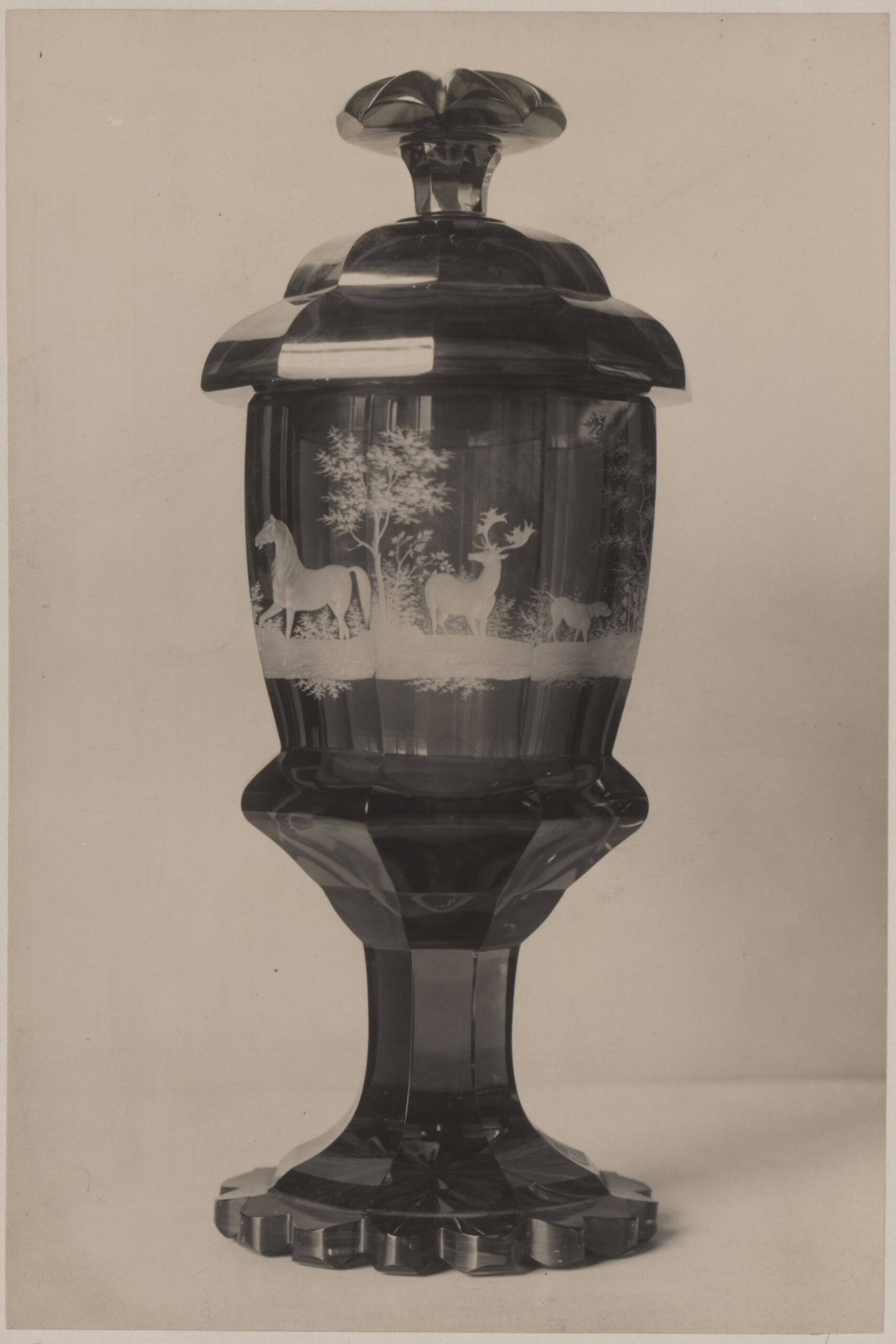 Fotografie, Fotografie eines Trinkbechers aus Glas mit Goldgitter und einer goldradierten Darstellung einer Landschaft mit Tieren, Anfang des 19. Jh., Bruno Reiffenstein, MAK Inv.nr. KI 8024-30