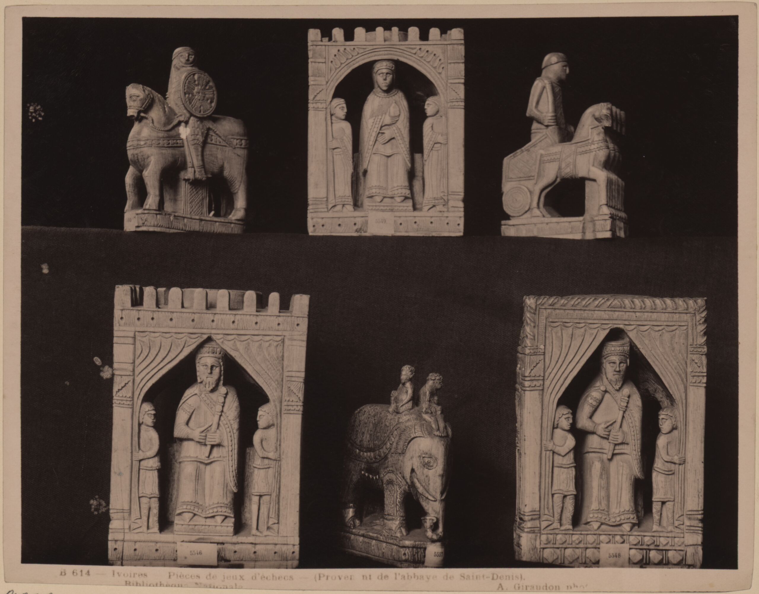 - Text am Objekt: [unten]: B 614 - Ivoires. - Pieces de jeux d'echecs. - (Provenant de l'abbaye de Saint-Denis) / Bibliotheque Nationale. A. Girandon, phot. [Untersatzkarton, links]: Paris, Bibliotheque Nationale [Untersatzkarton, rechts]: Schachspielsteine aus Elfenbein (aus der Abtei St. Denis)