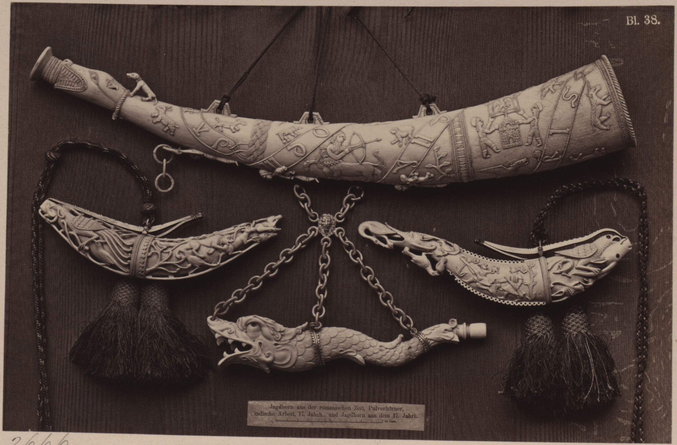 - Text am Objekt: [unten]: Jagdhorn aus der romanischen Zeit, Pulverhörner, / indische Arbeit, 17. Jahrh. und Jagdhorn aus dem 17. Jhdt. [Untersatzkarton, links]: Dresden, Historisches Museum. [Untersatzkarton, rechts]: Jagdhorn aus roman. Zeit, indische Pulverhörner 17. Jhdt. u. Jagd- / horn des 17. Jhdts.