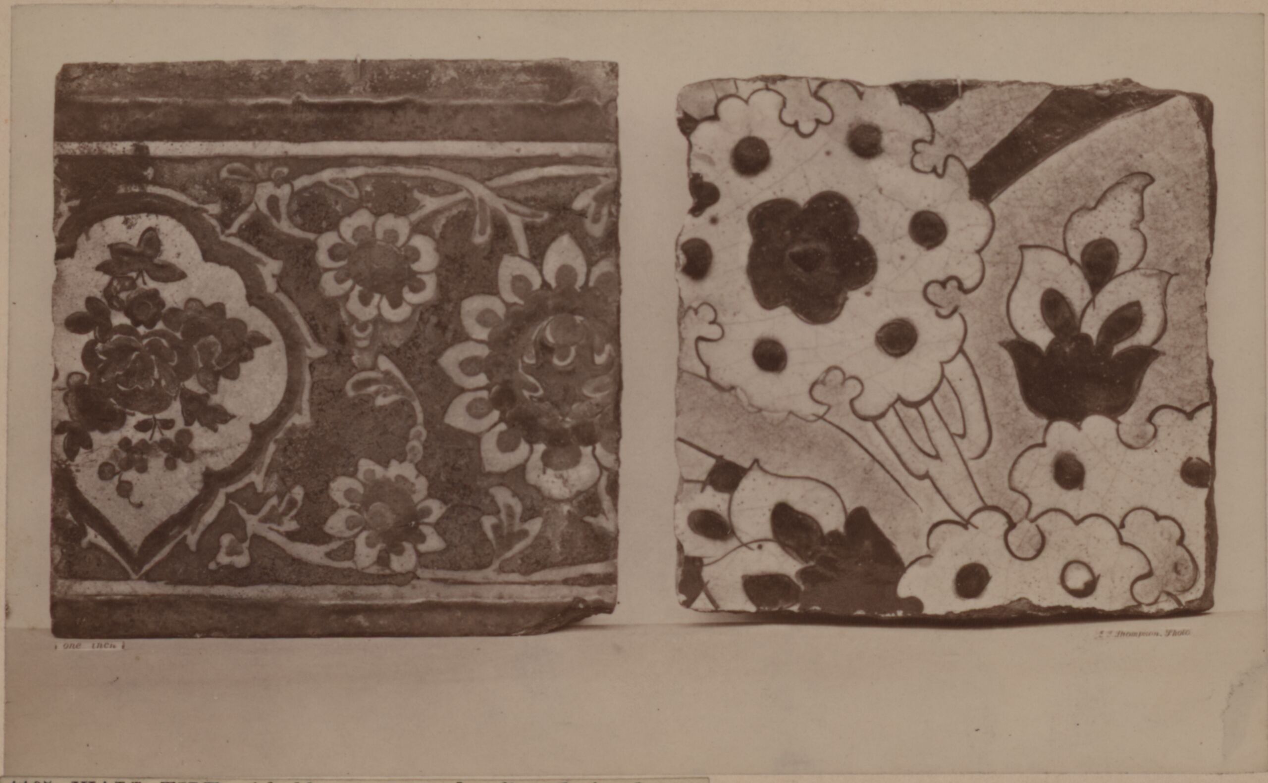 Fotografie, Fotografie von zwei bunten, persischen Fayence-Fliesen aus einer Ausstellung des ehem. South Kensington Museum, London, Charles Thurston Thompson, MAK Inv.nr. KI 16355-2