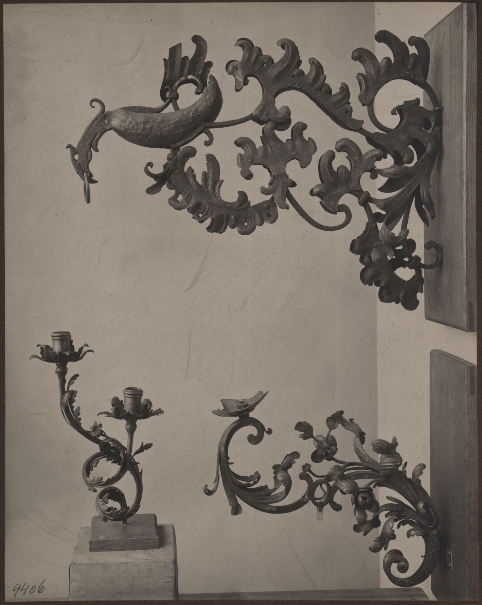 - Fotografie von zwei eisernen Schildträgern und eines Wandleuchters (vom Bearbeiter vergebener Titel)