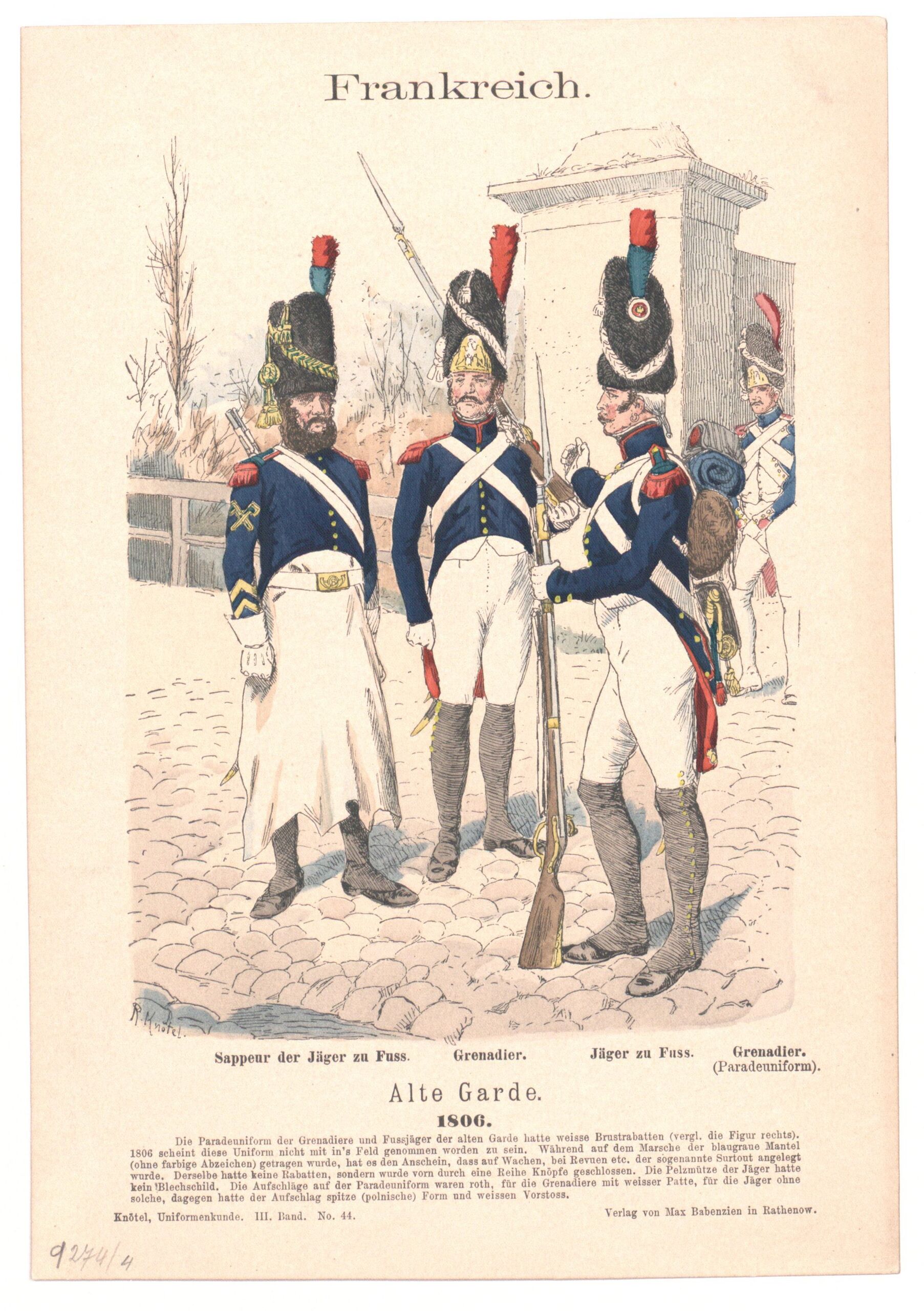 - Text am Objekt: R. Knötel.; Frankreich.; Sappeur der Jäger zu Fuß. Grenadier. Jäger zu Fuß. Grenadier /(Paradeuniform). / Alte Garde. / 1806. / [...] / Knötel Uniformenkunde. II. Band. No. 44.; Verlag von Max Babenzien in Rathenow.