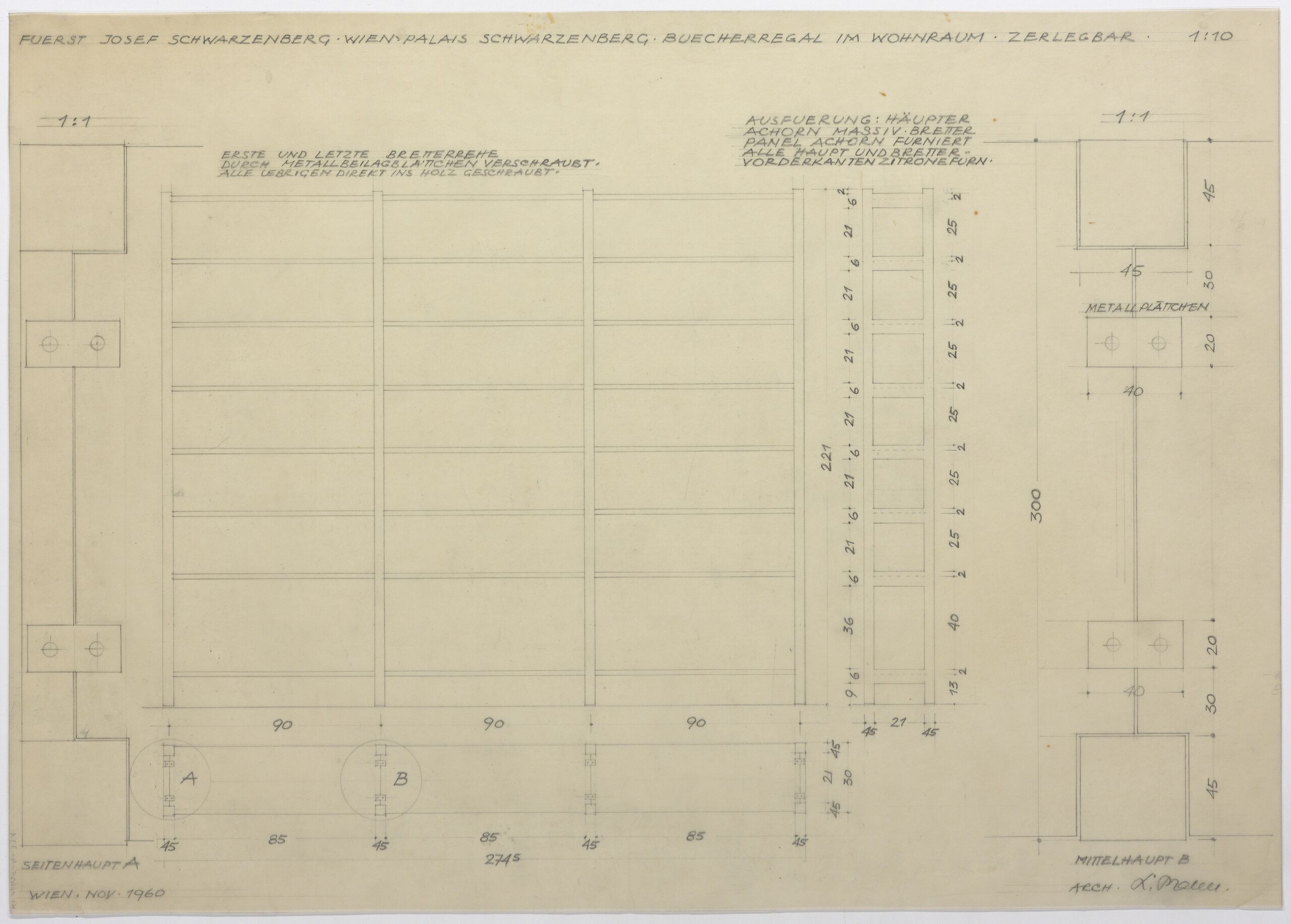 - Text am Objekt (oben) : FUERST JOSEF SCHWARZENBERG WIEN PALAIS SCHWARZENBERG BUECHERREGAL IM WOHRAUM ZERLEGBAR 1:10 / [Details zu der Ausführung]
