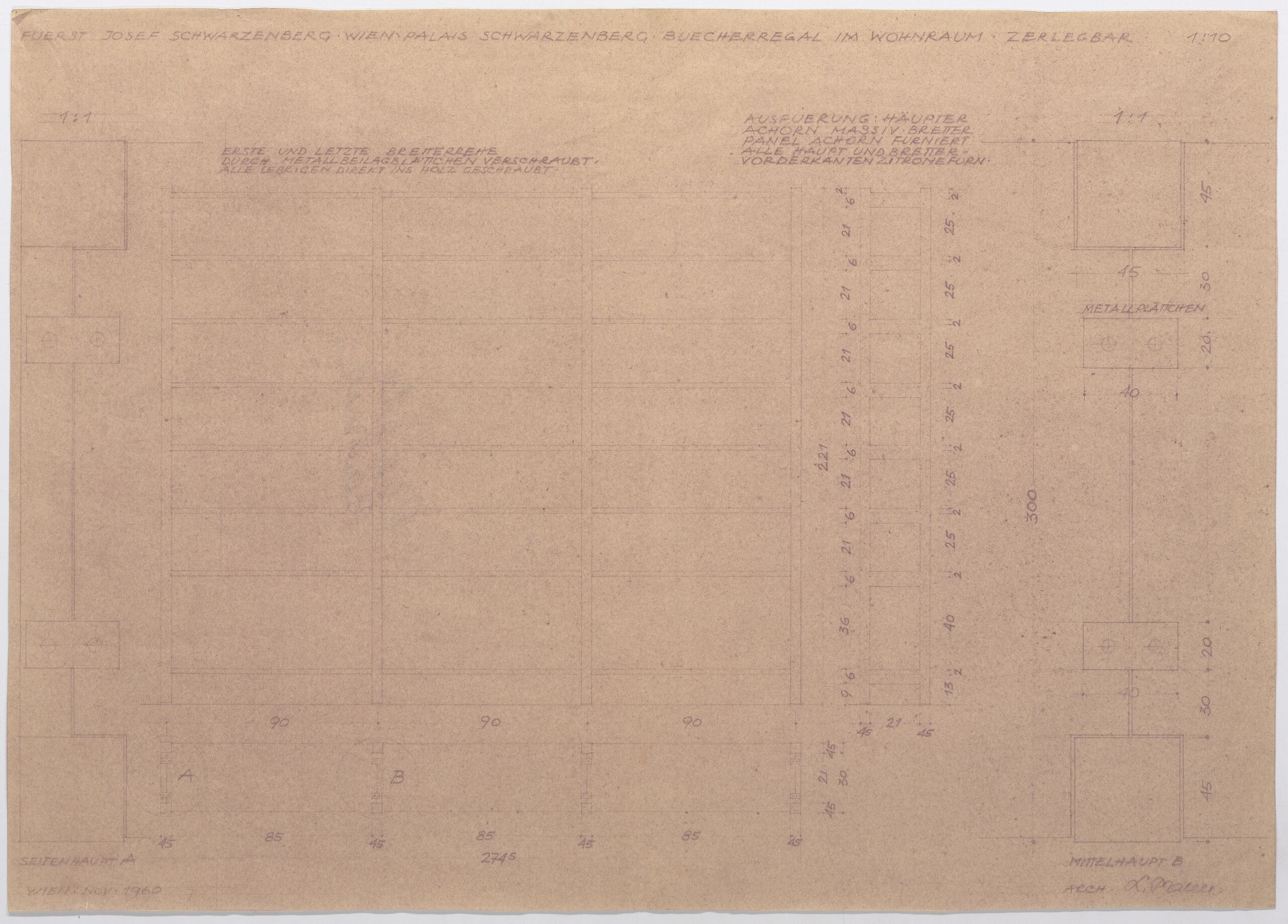 - Text am Objekt (oben) : FUERST JOSEF SCHWARZENBERG WIEN PALAIS SCHWARZENBERG BUECHERREGAL IM WOHRAUM ZERLEGBAR 1:10 / [Details zu der Ausführung]