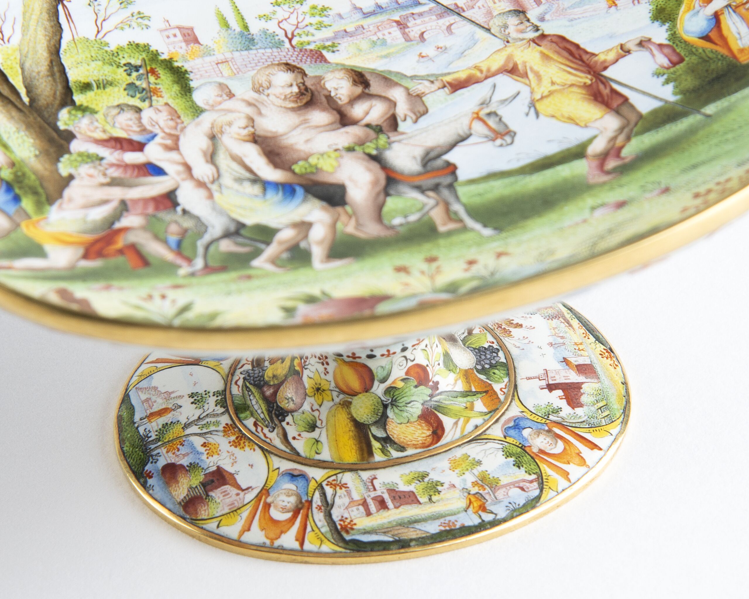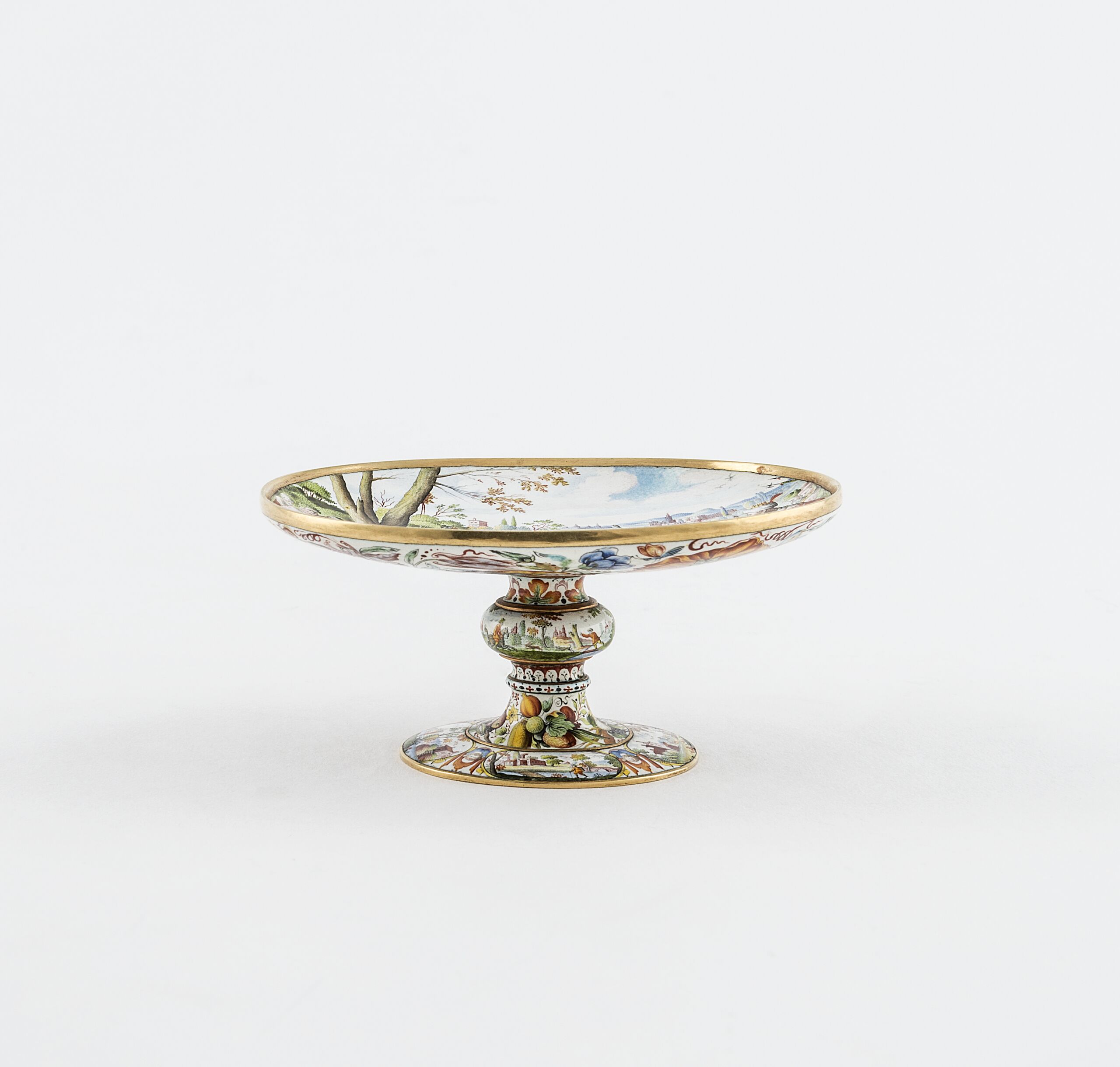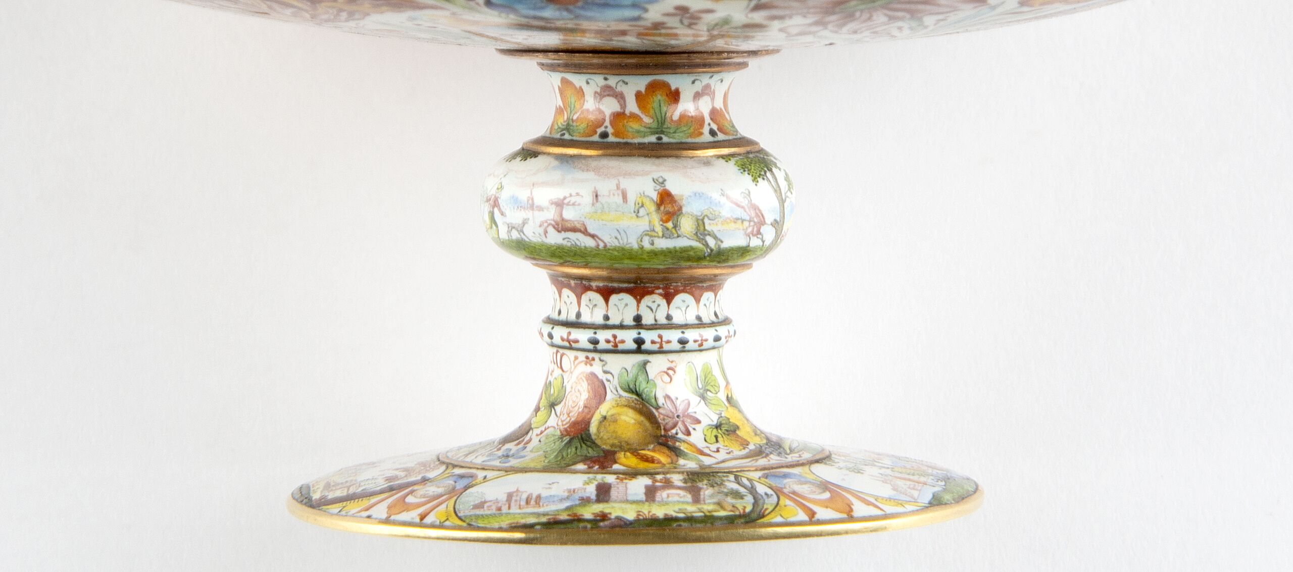 Fußschale mit Malerei - auf der Schalenoberseite Silenenzug in einem weiträumigen Panorama; auf der Schalenunterseite Blumen und Papageien; am Schaft kleines Blattwerk in der Kehle, am Wulst in winzigem Maßstab Jagdszenen in weiter Landschaft.