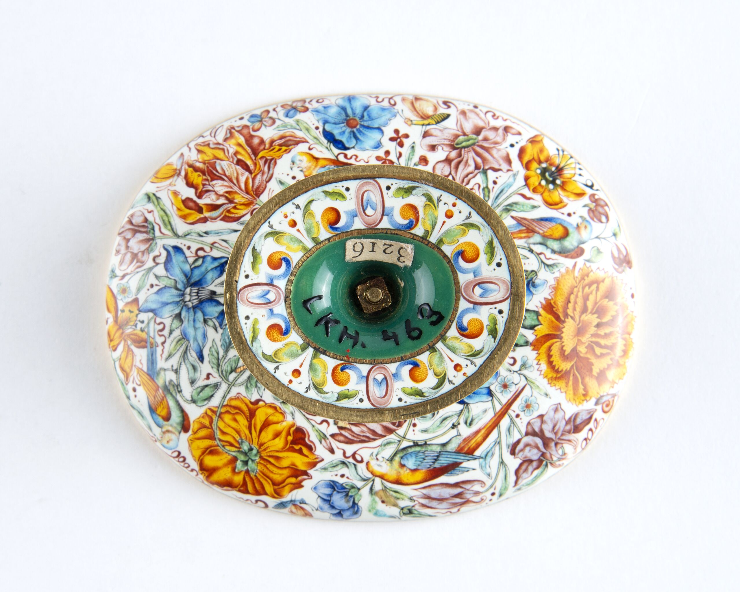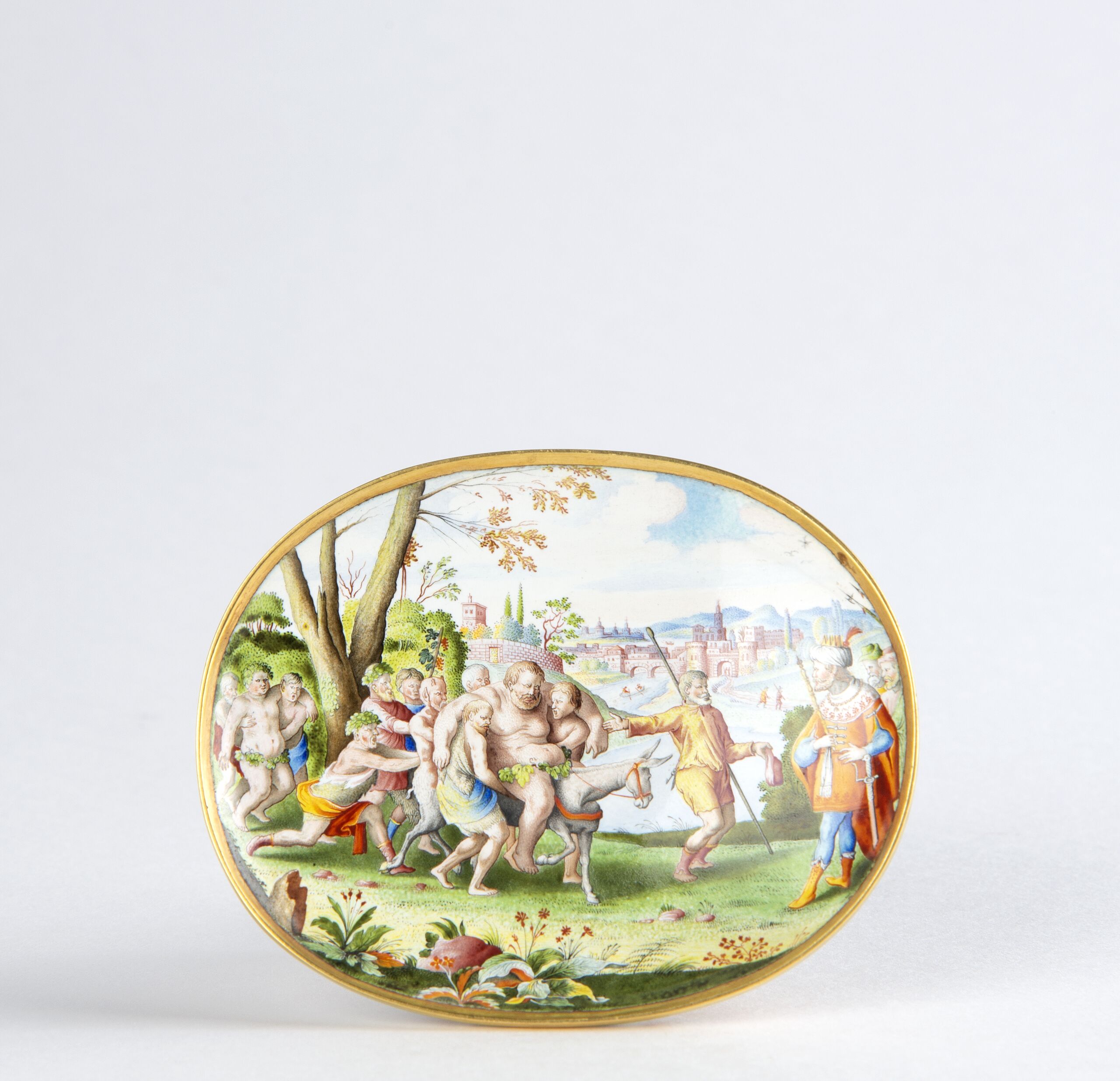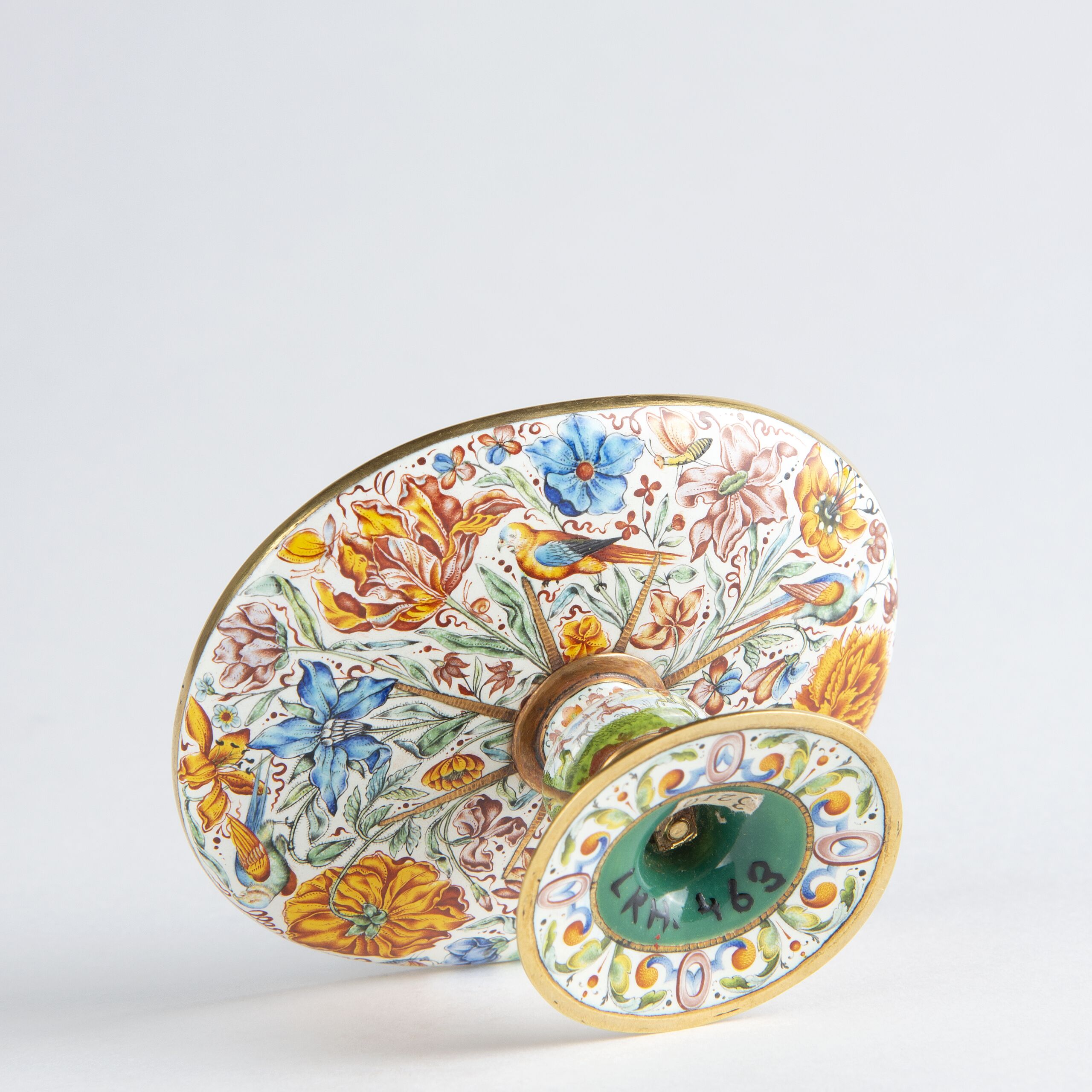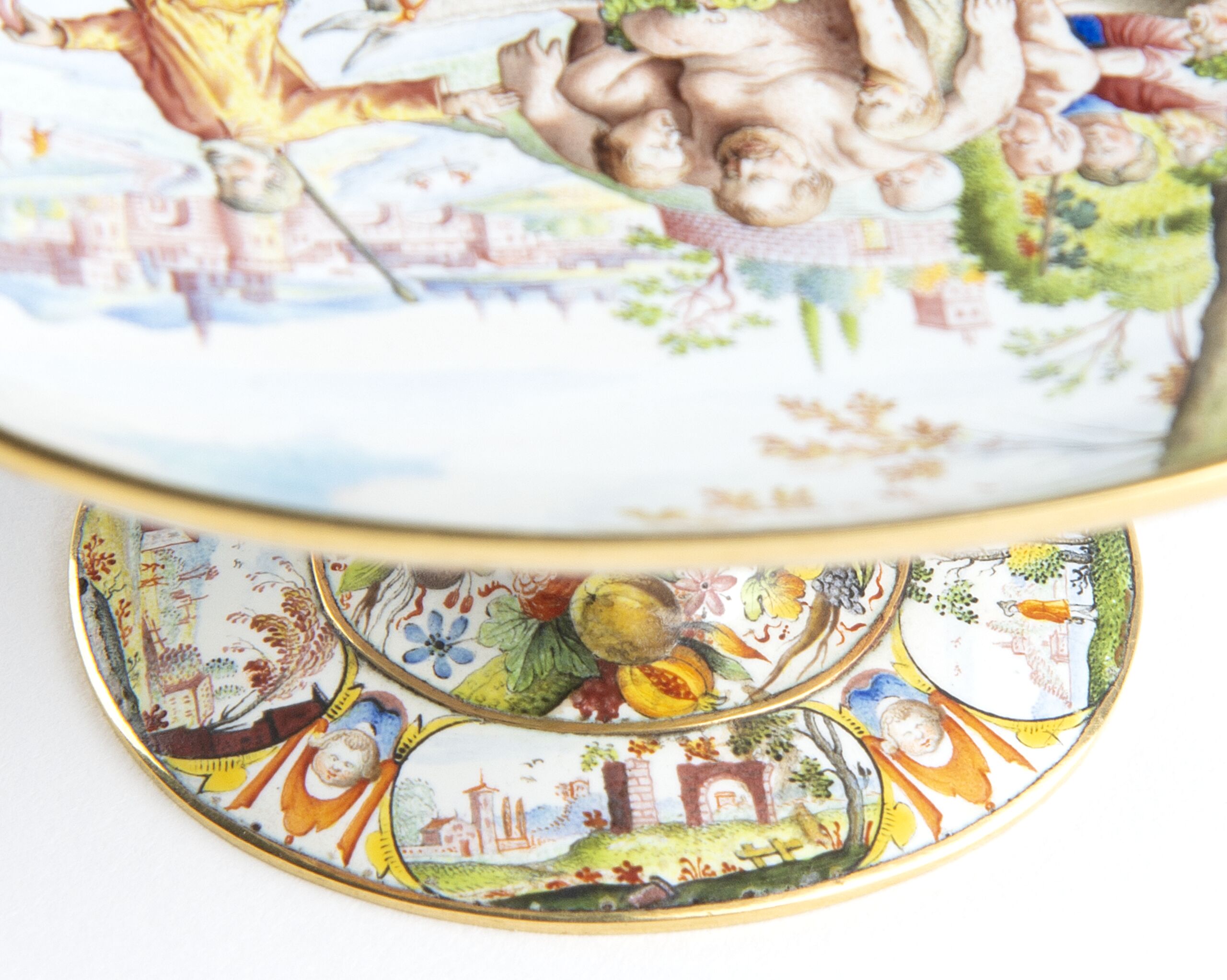 Fußschale mit Malerei - auf der Schalenoberseite Silenenzug in einem weiträumigen Panorama; auf der Schalenunterseite Blumen und Papageien; am Schaft kleines Blattwerk in der Kehle, am Wulst in winzigem Maßstab Jagdszenen in weiter Landschaft.